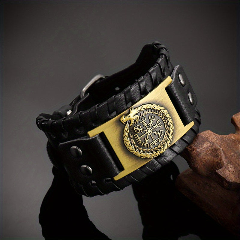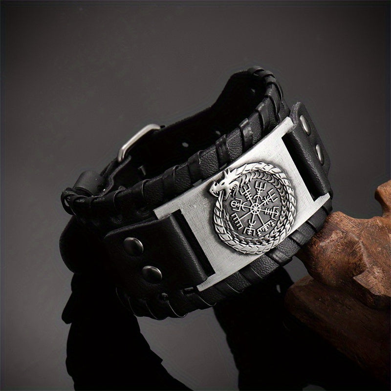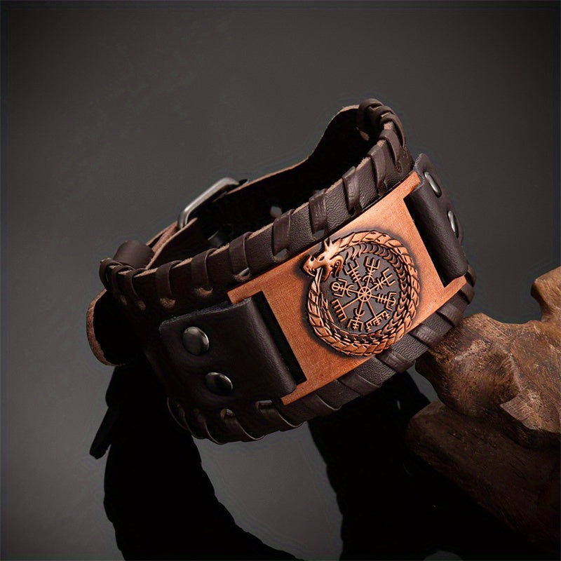 Add a touch of rugged style to your look with this wide leather bracelet featuring a pirate and compass pattern design. Made for men with a vintage-inspired aesthetic.