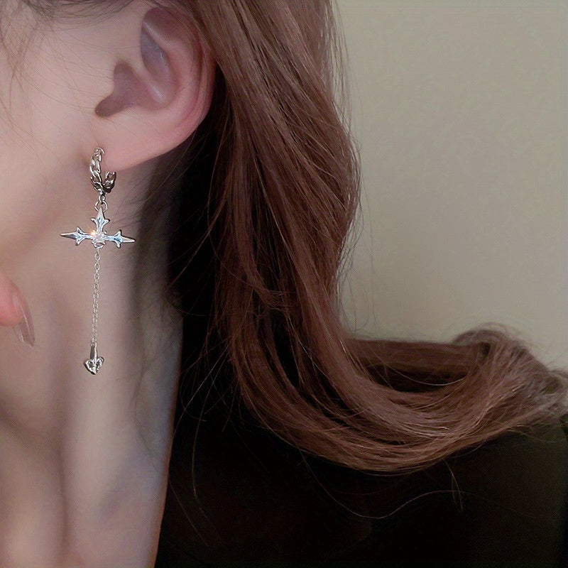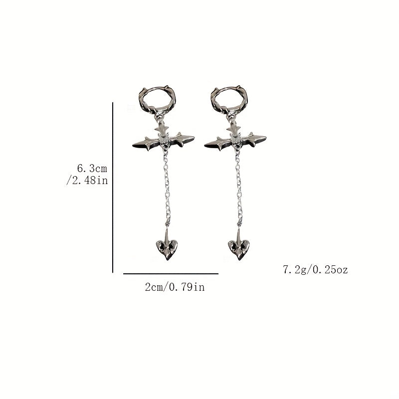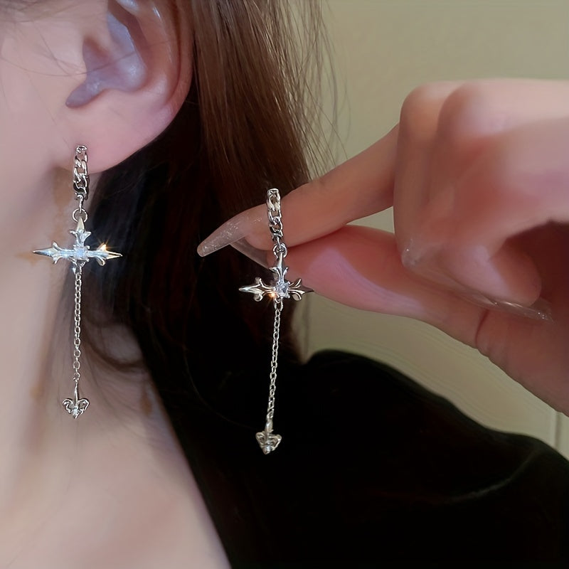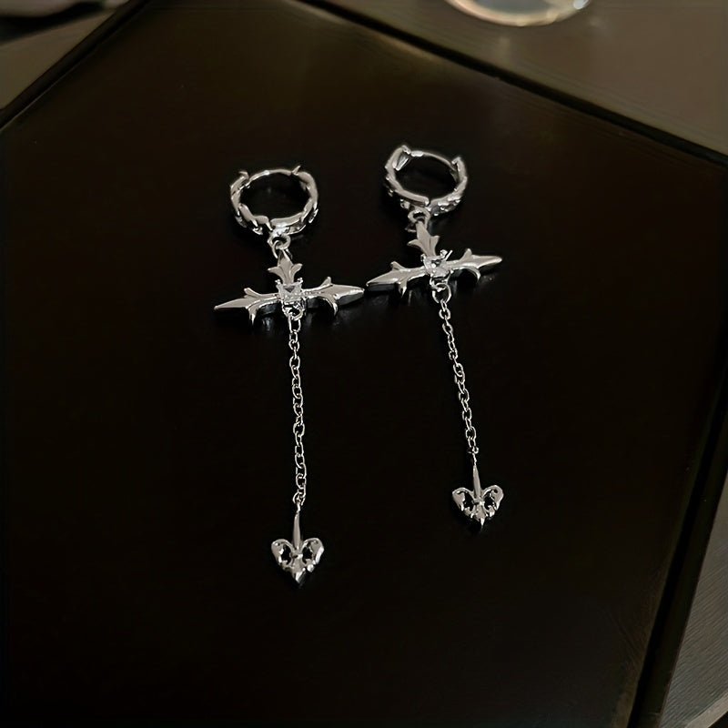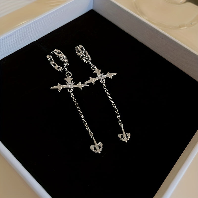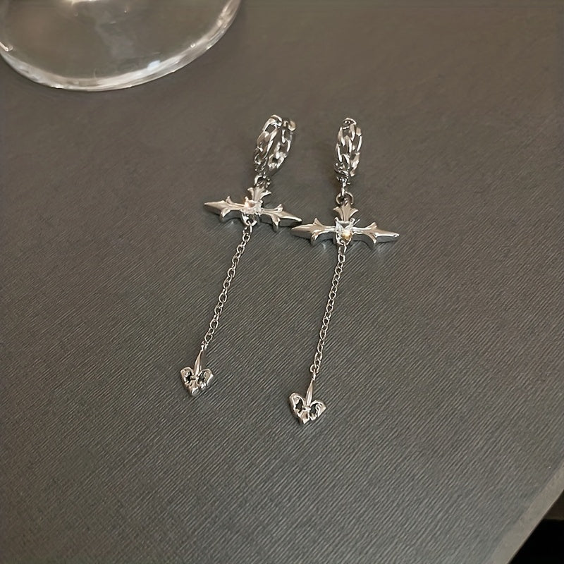 Elegant drop earrings featuring a cross design with tassel accents and sparkling zircon stones. Made of high-quality copper.