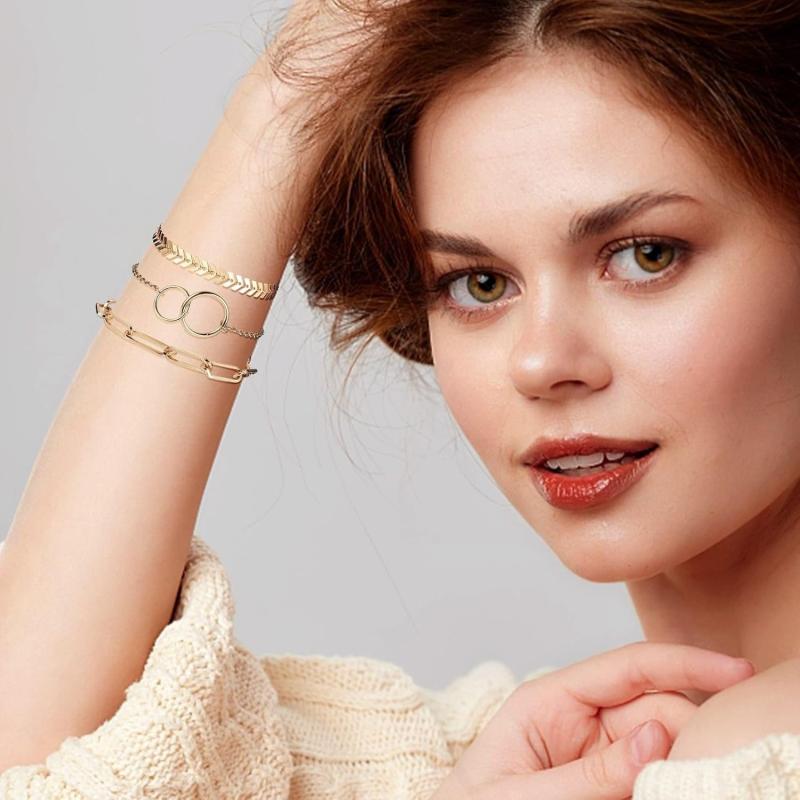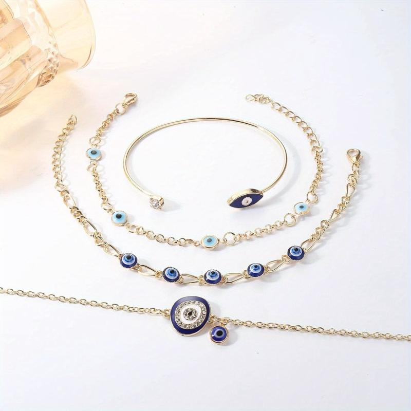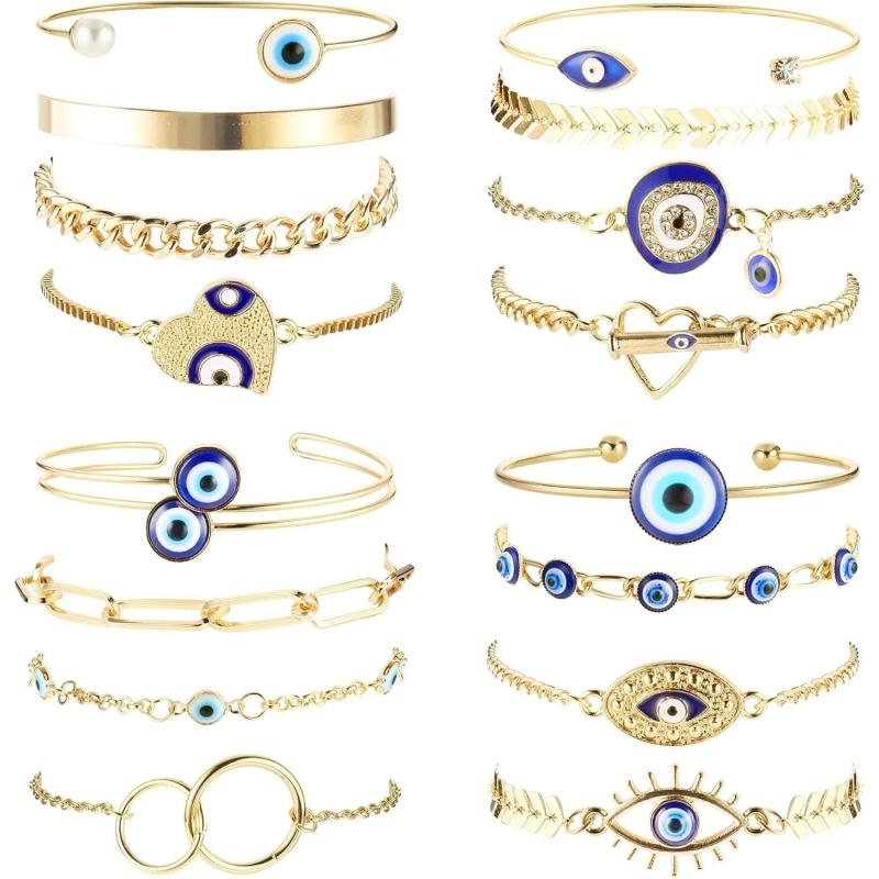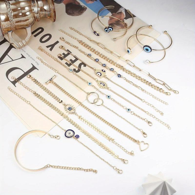 This set includes 16 evil eye bracelets for protection and luck. Featuring golden chains and colorful evil eye beads, these bracelets are a stylish addition to any outfit.