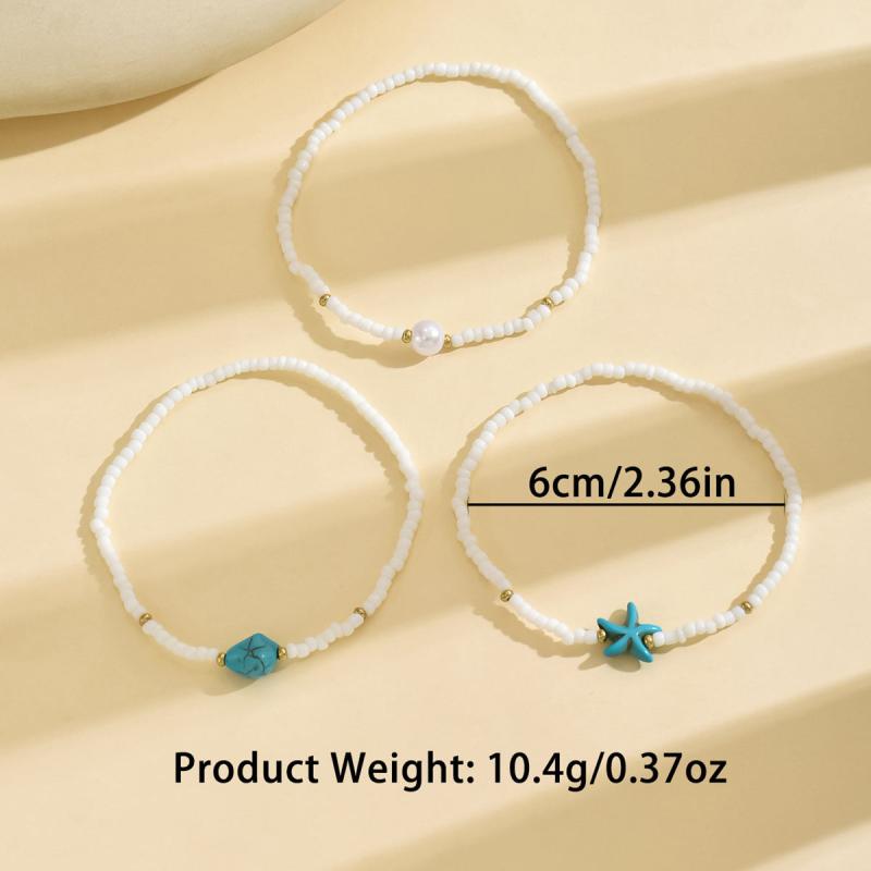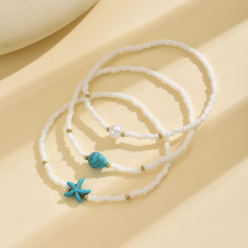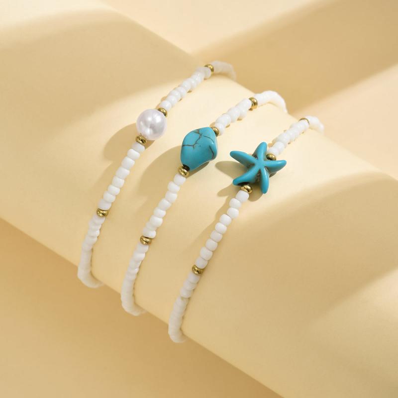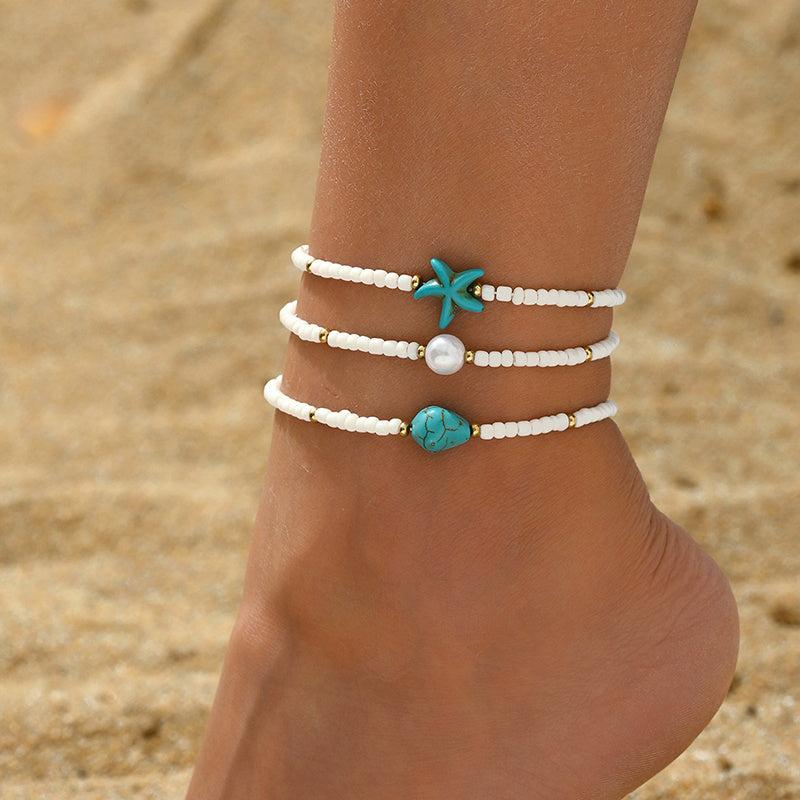Get ready for summer vacation with this set of 3 elastic ankle bracelets featuring beautiful glass beads and charms. Perfect for adding a touch of style to your beach or poolside look.