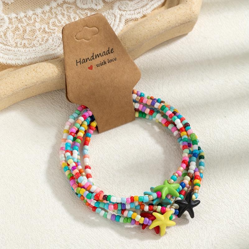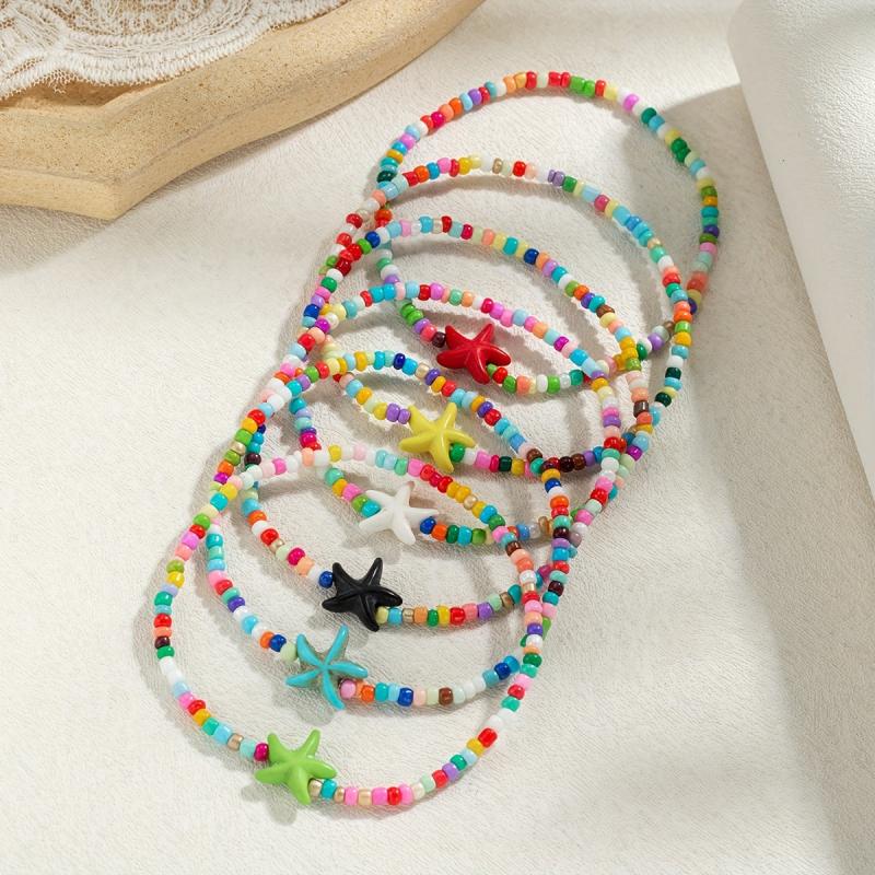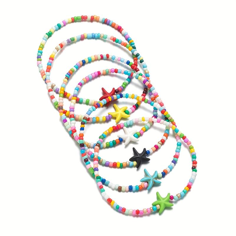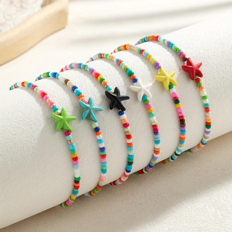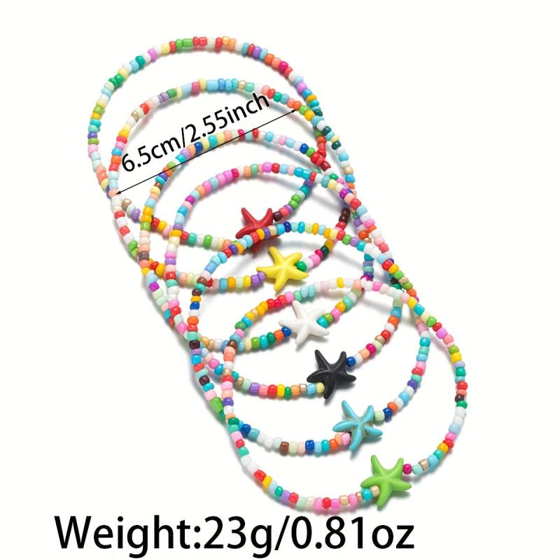 Add a touch of summer beach style to your look with this colorful 6pcs beaded ankle bracelet set featuring starfish charms. Made of high-quality resin material, these stackable ankle bracelets are versatile and perfect for women.