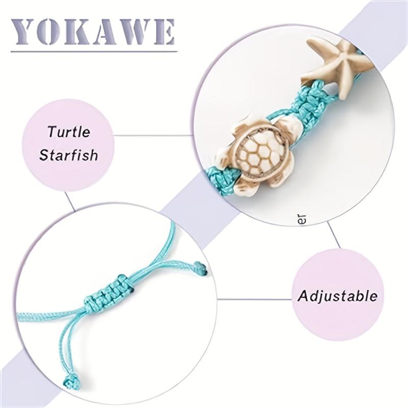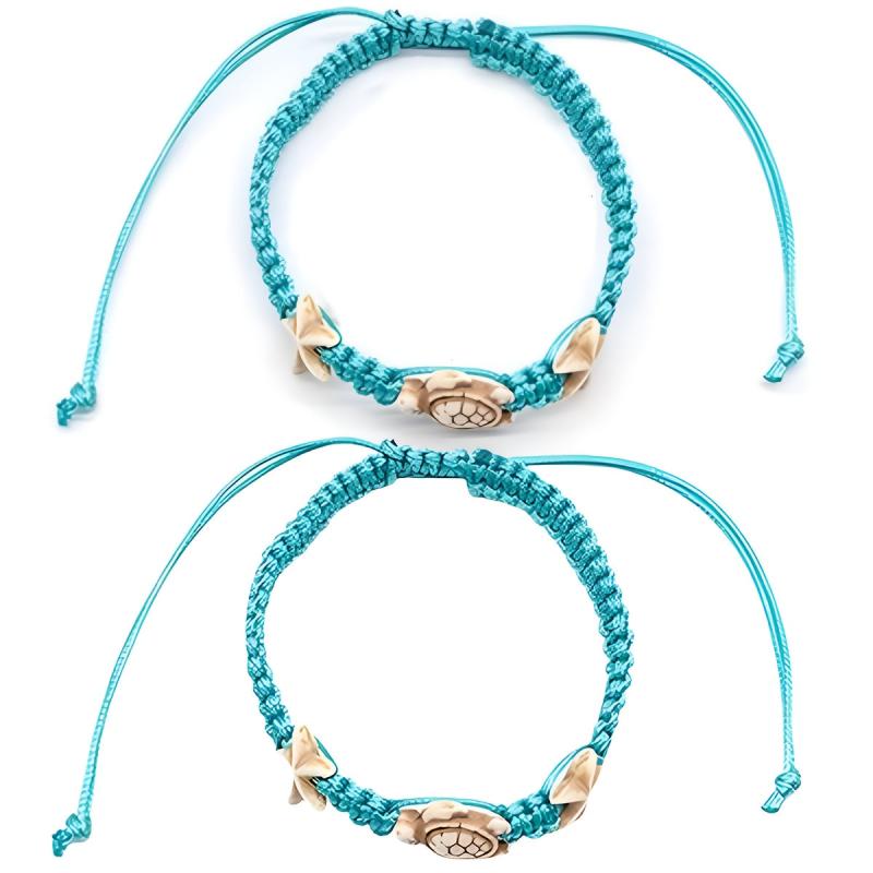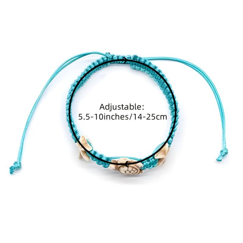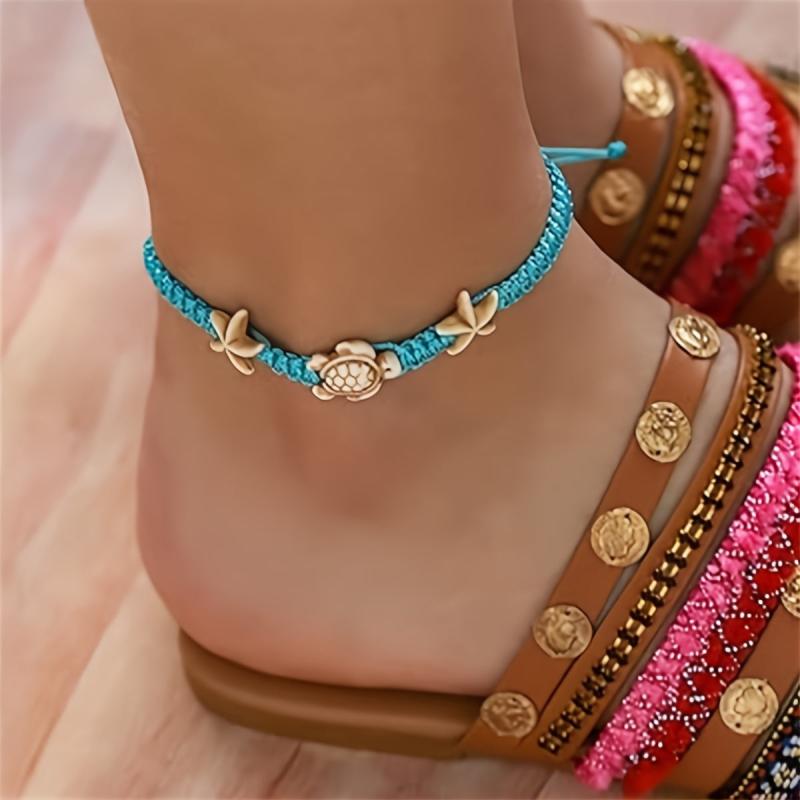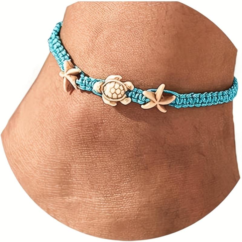 This set includes a versatile anklet and bracelet featuring charming turtle and starfish charms. Adjustable design to fit any wrist or ankle size. A must-have accessory for any beach lover.