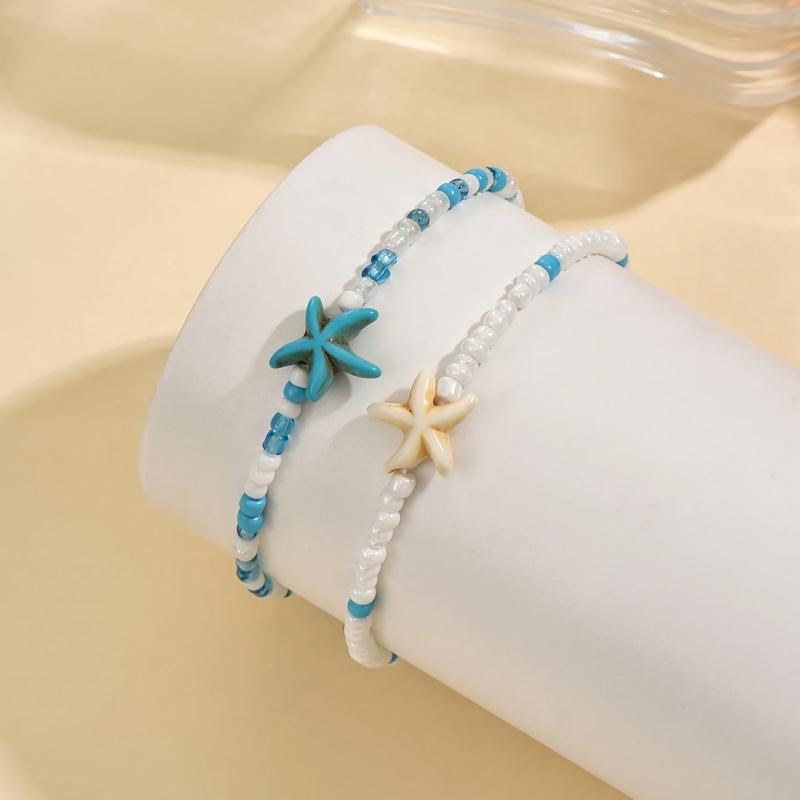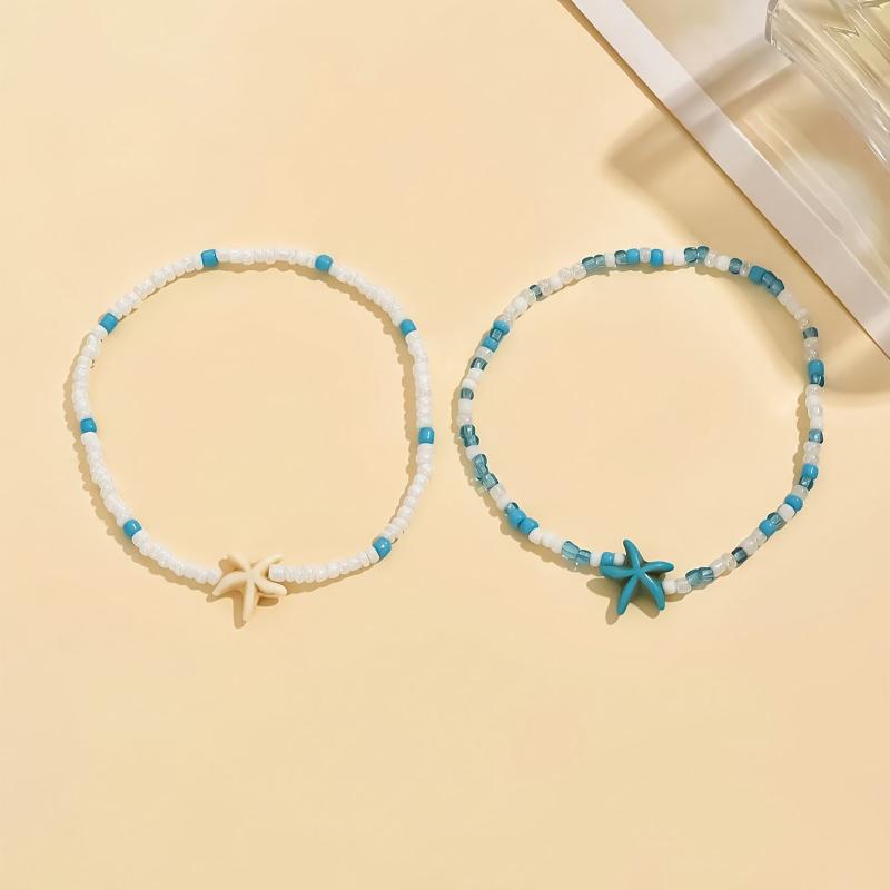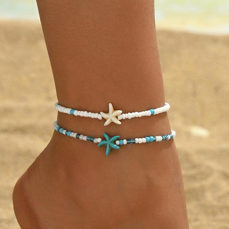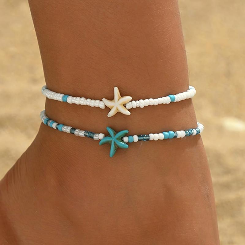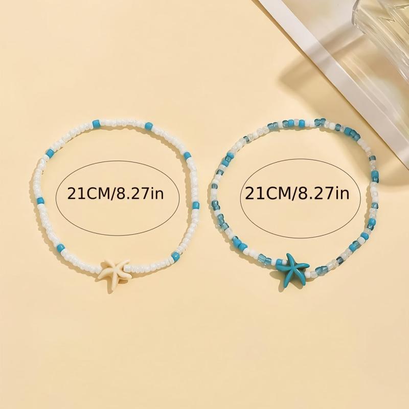 Enhance your beach look with this 2pcs bohemian style ankle bracelet set featuring glass beads and star charms that are perfect for vacations and daily wear.