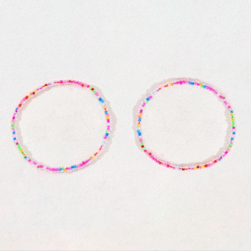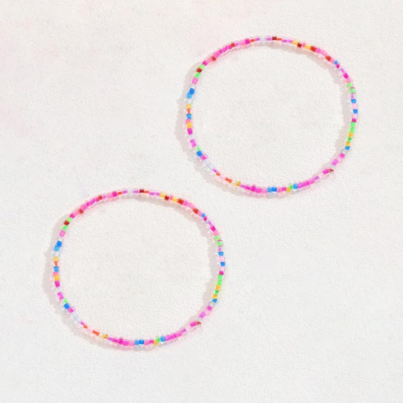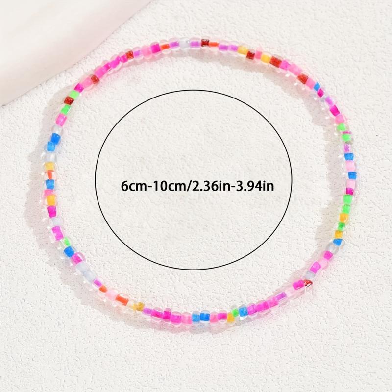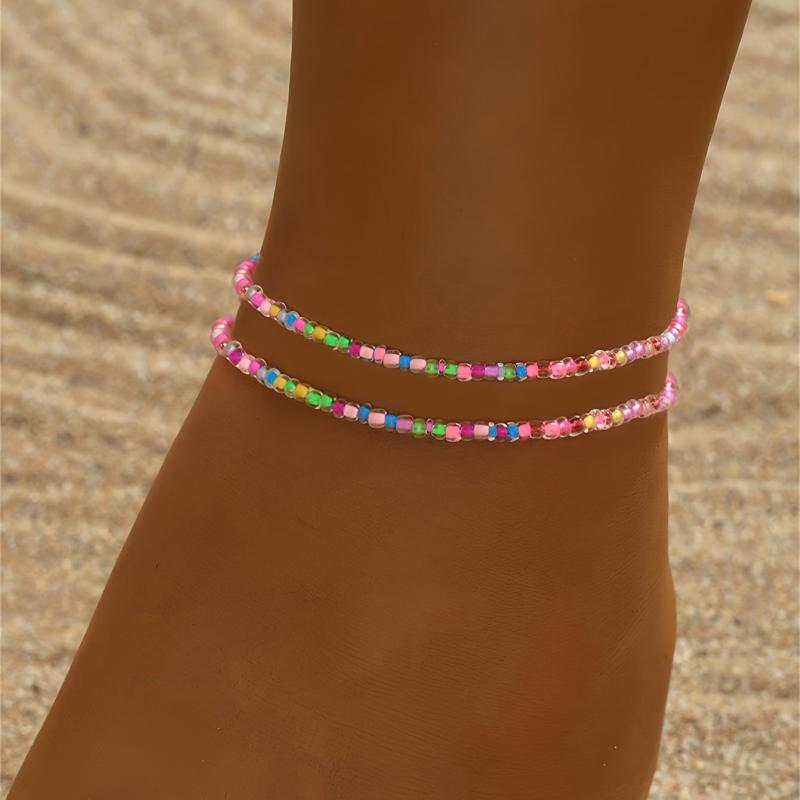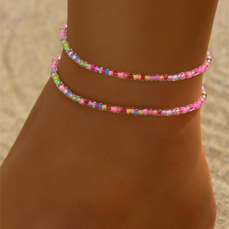 Elegant 2pcs boho style elastic anklet and bracelet set with mini rice beads and glass, perfect foot jewelry for summer beach vacations. Suitable for all seasons.