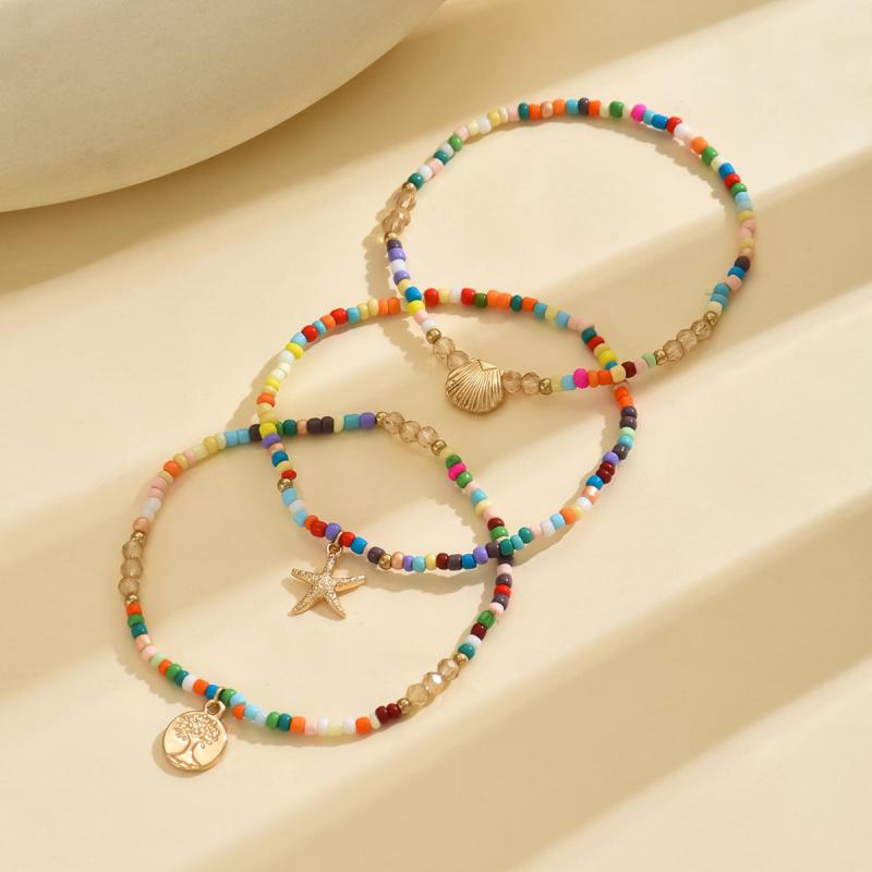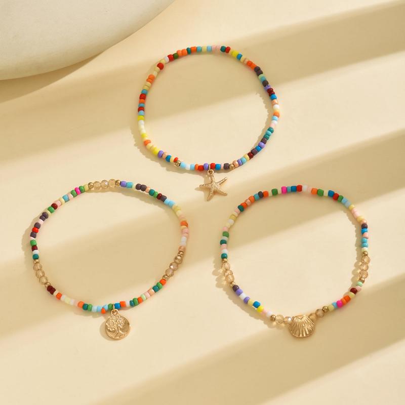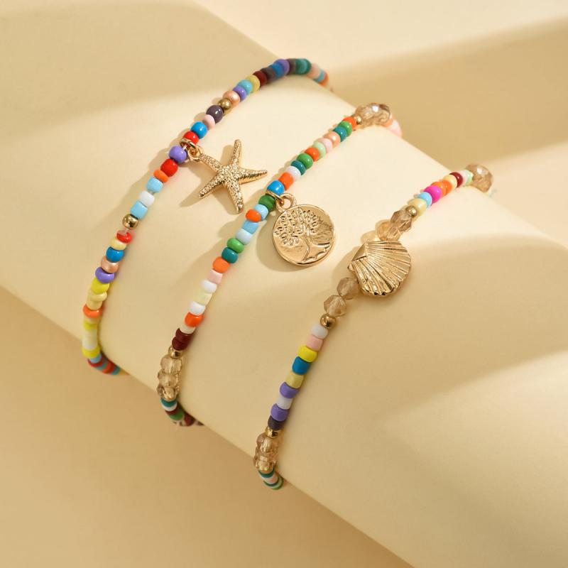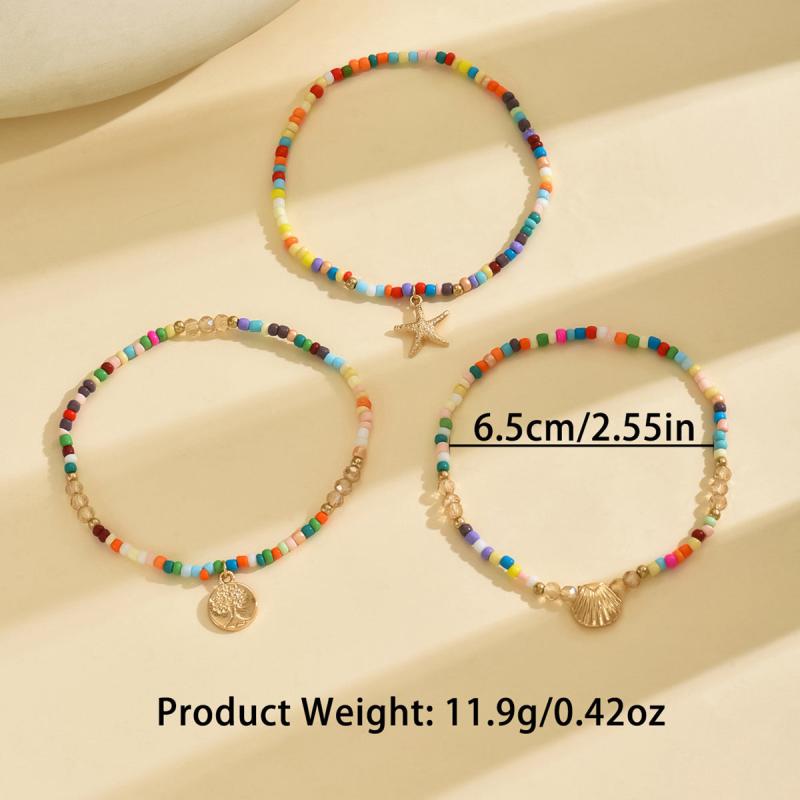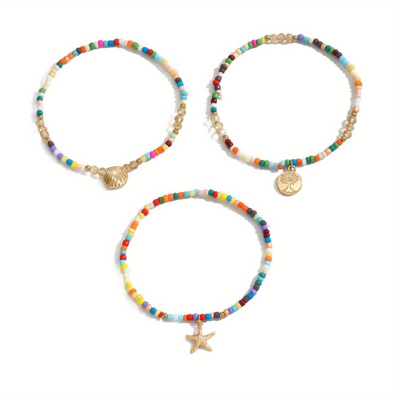 Elevate your beach look with these 3 bohemian ankle bracelets featuring starfish, scallop, and palm tree charms. Each anklet boasts colorful elastic beads for a fun and stylish touch.