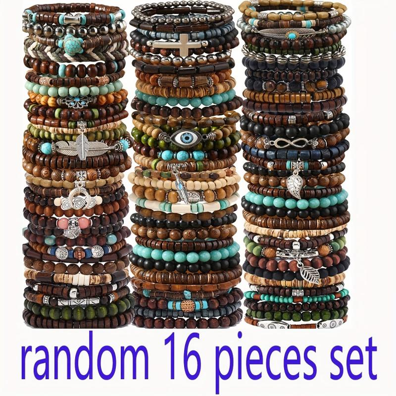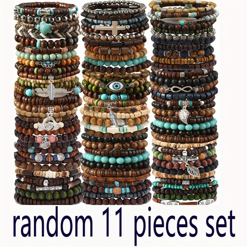 This set includes 10 bohemian style wooden beaded bracelets, perfect for couples or as a gift. The bracelets are handcrafted and feature a combination of colors and patterns.