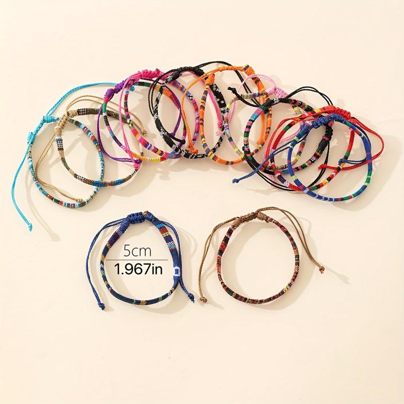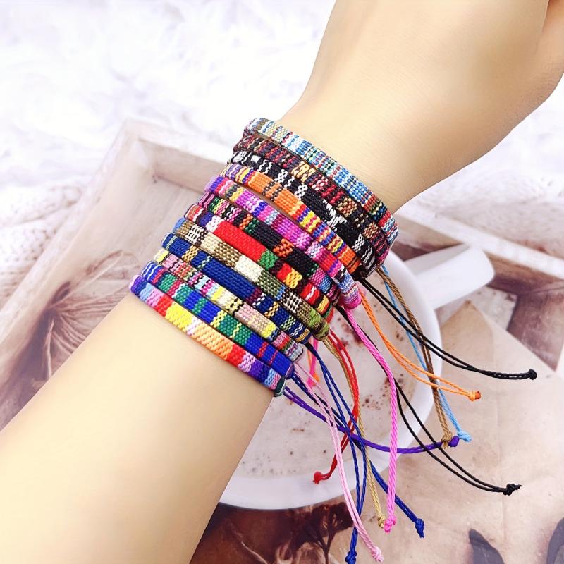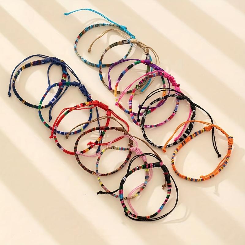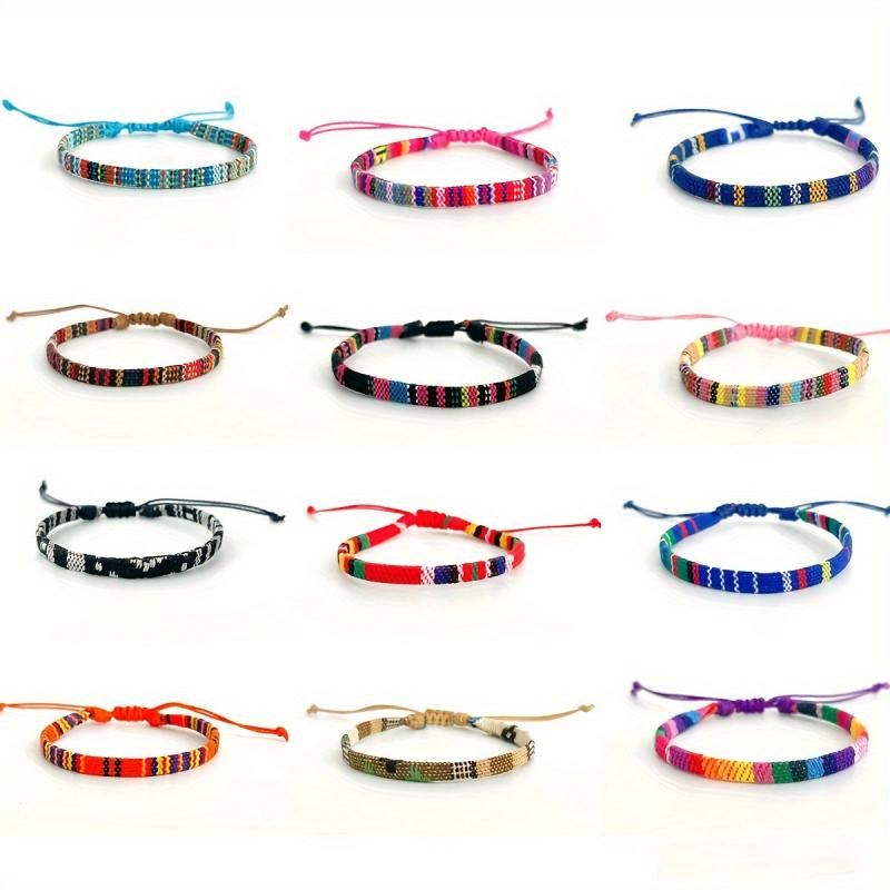 Elevate your style with this set of 12 Bohemian hand-woven bracelets made from linen fabric. Each bracelet is adjustable and perfect for daily wear or holiday parties.