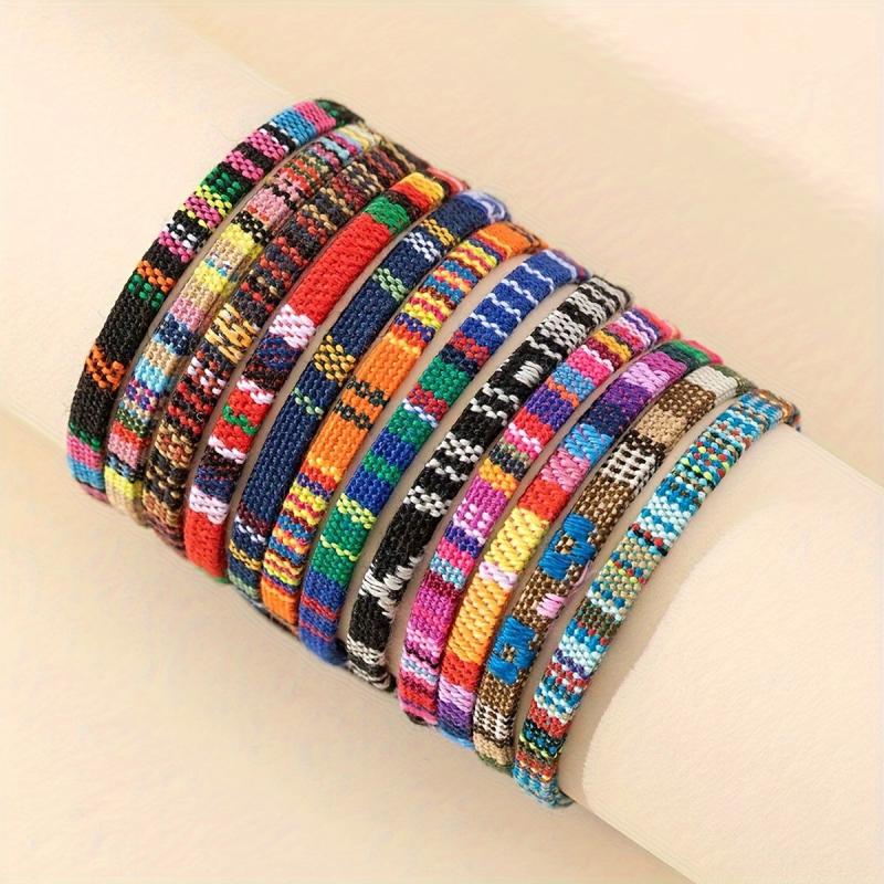 • Set of 12 Bohemian hand-woven linen fabric bracelets