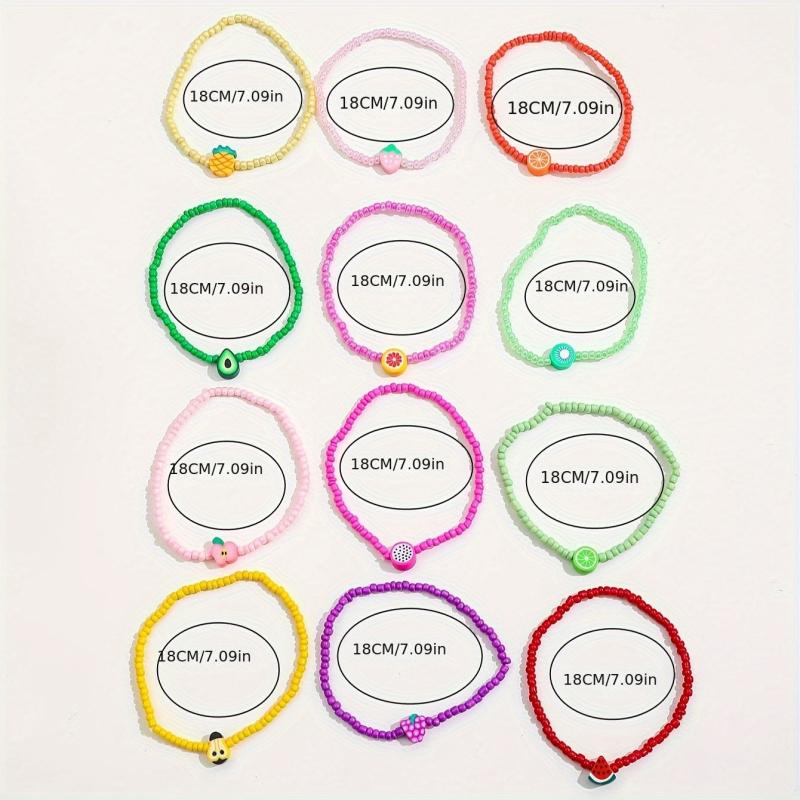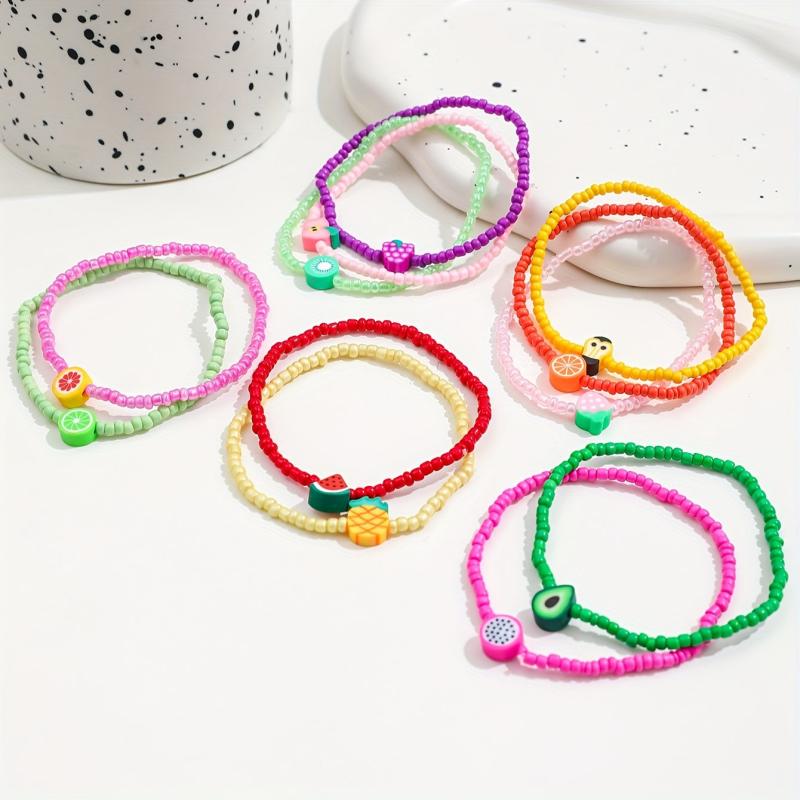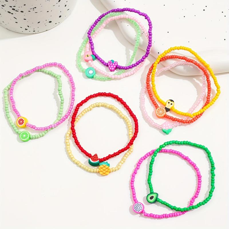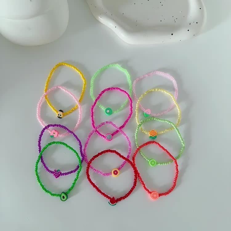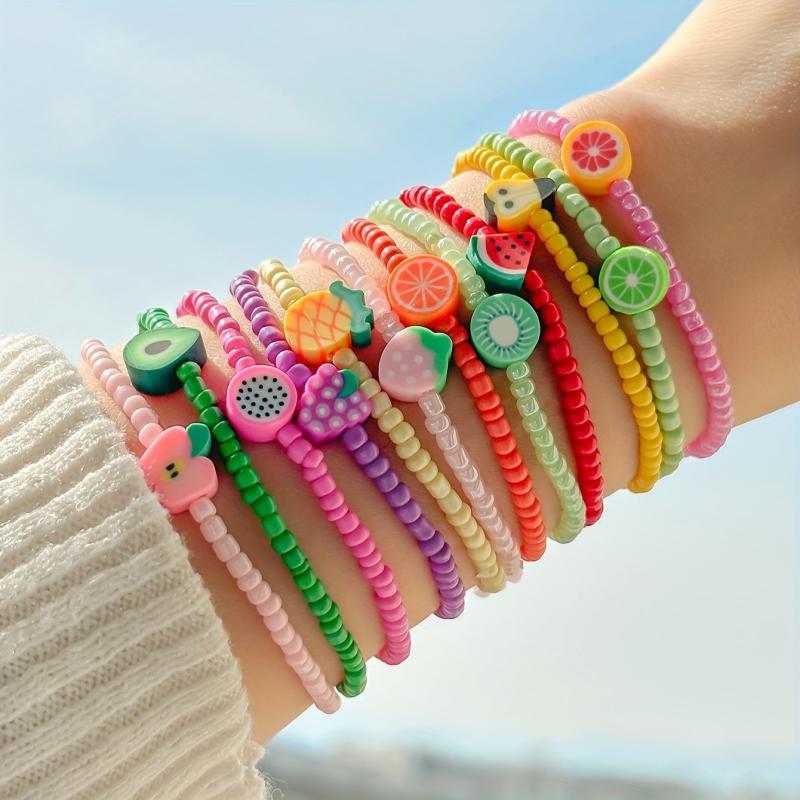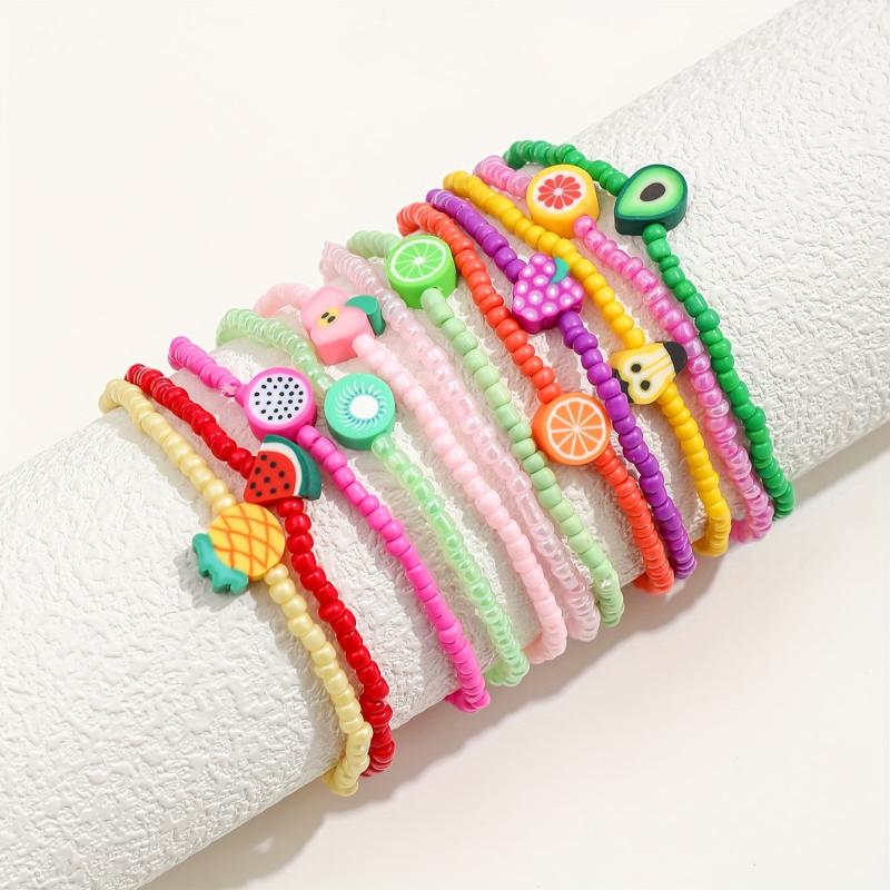 Add a pop of color to your outfit with this vibrant set of glass bead bracelets. Perfect for parties and all-season use, these playful accessories feature glossy designs inspired by fruits and flowers.