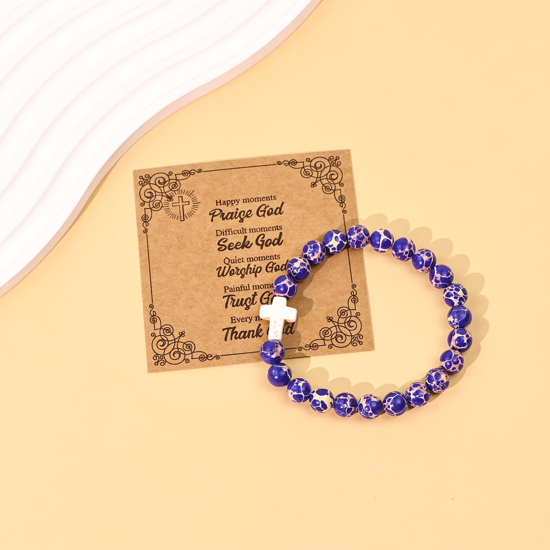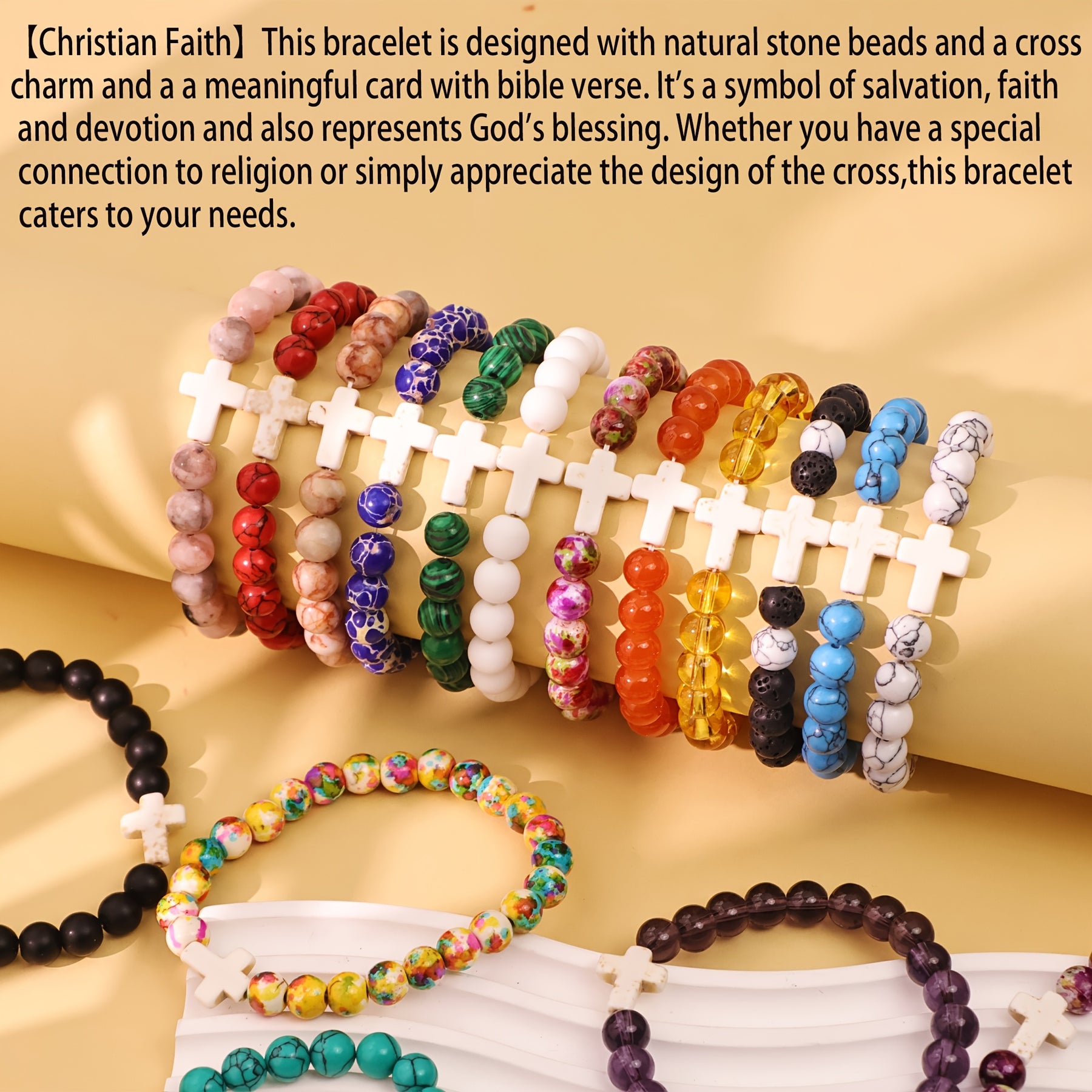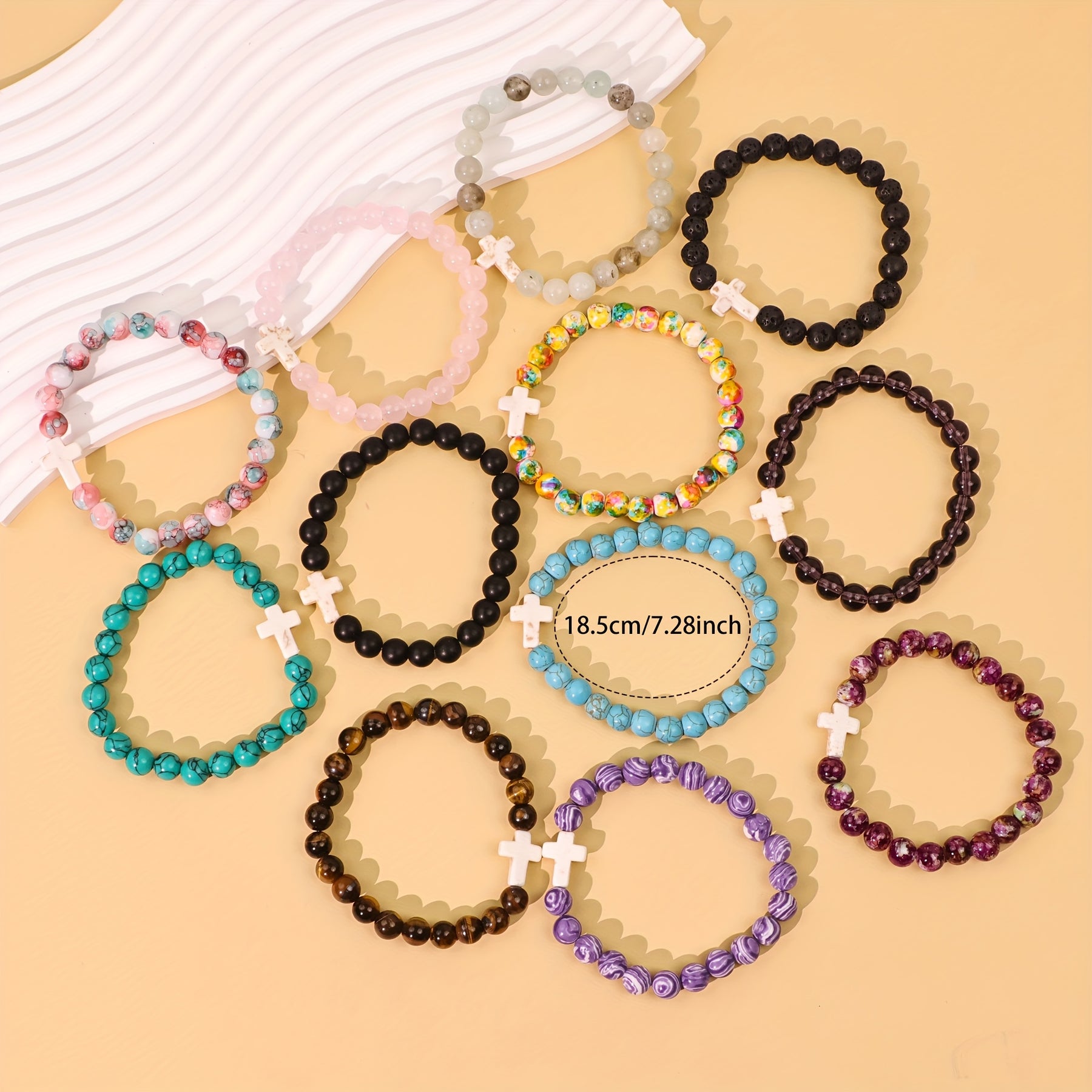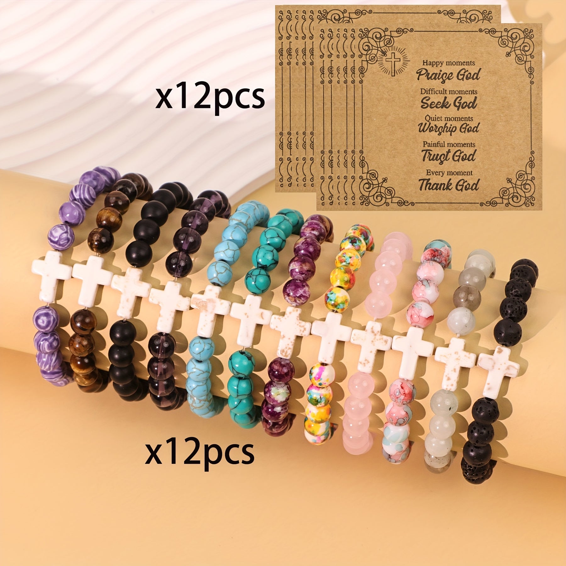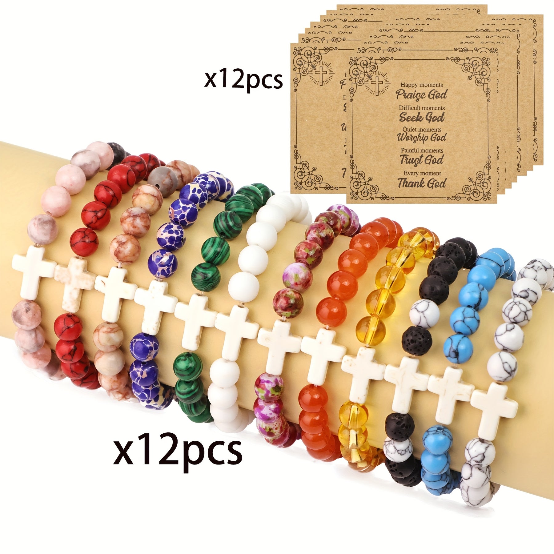 This set includes 12 women's cross beaded bracelets featuring 8mm natural stones paired with glass beads. These Christian religious bracelets are a beautiful expression of faith.