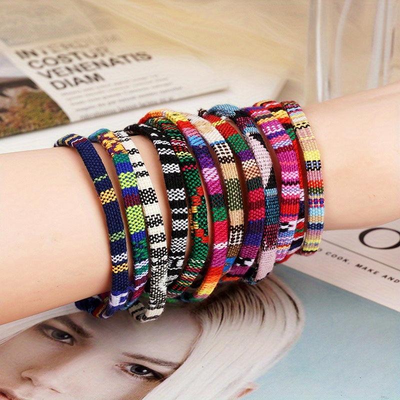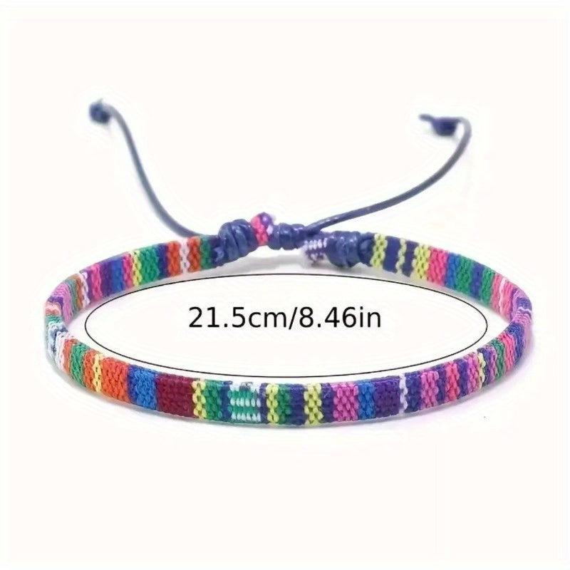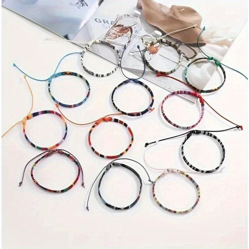 Get this set of 12 colorful woven bracelets for men and women. These bohemian-style bracelets are perfect for expressing your unique style and sharing with friends.