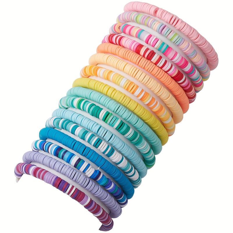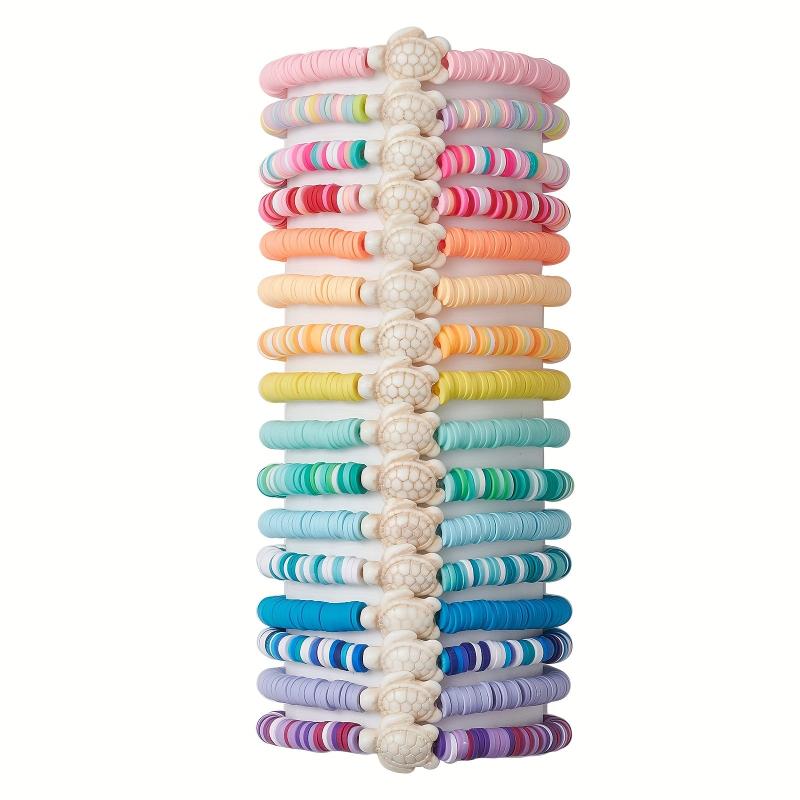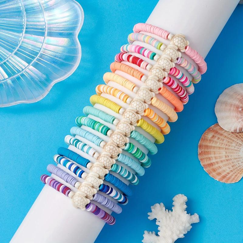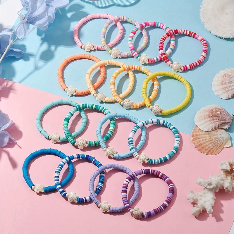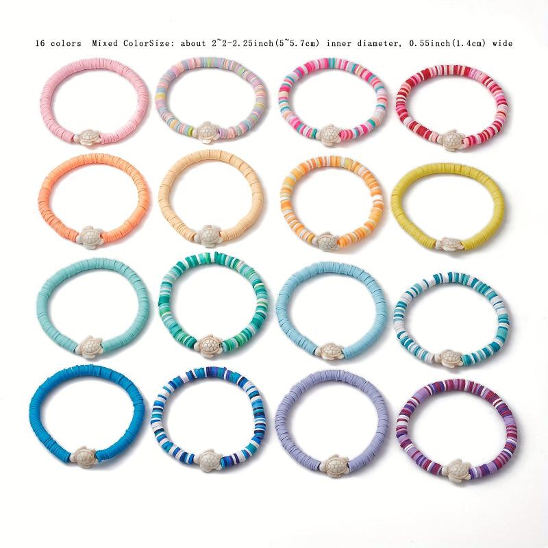 Add a touch of beach-inspired charm to your look with these 16pcs polymer clay beaded stretch bracelets featuring adorable turtle designs. The mixed colors and soft clay beads make these bracelets perfect for casual beach outings.