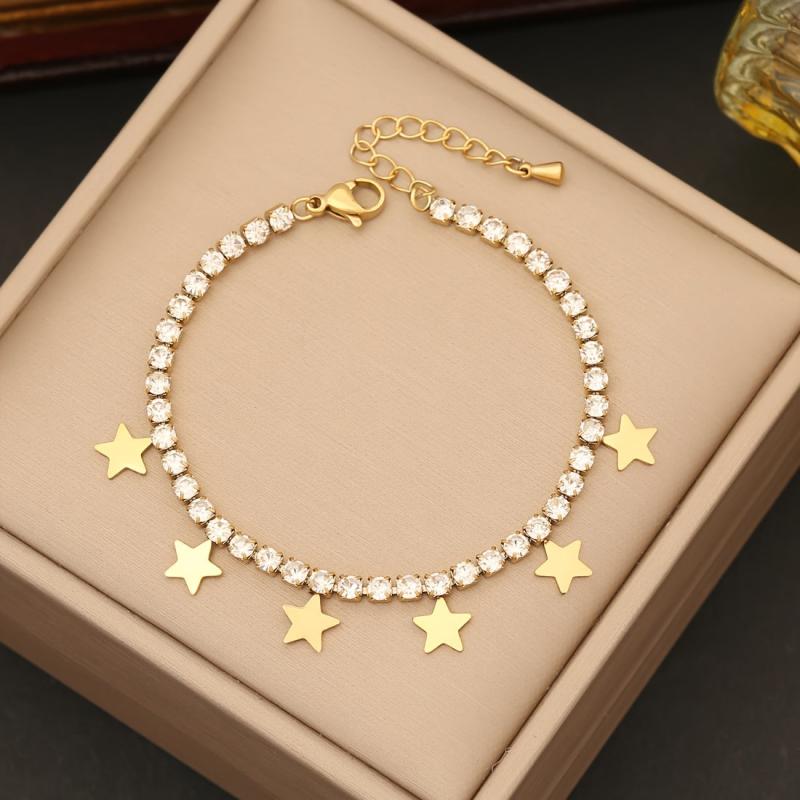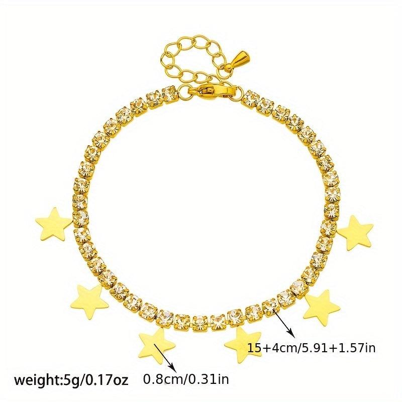 Elegant 18K gold plated titanium steel bracelet with sparkling rhinestones and star charms. Perfect for daily wear or special occasions. Great gift for friends and loved ones.
