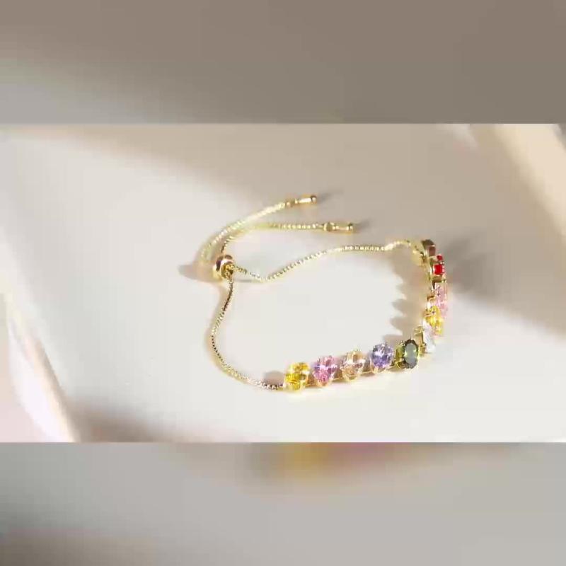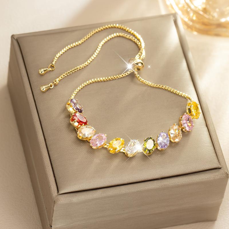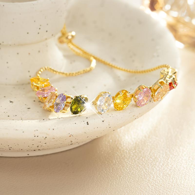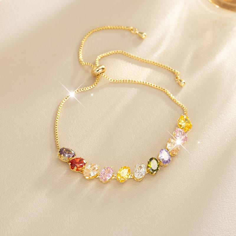 This stunning tennis bracelet features a rainbow of synthetic zirconia stones set in 18K gold plated copper. The adjustable slider design ensures a perfect fit for any wrist, making it ideal for women born in December.