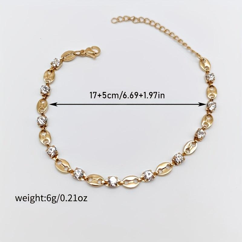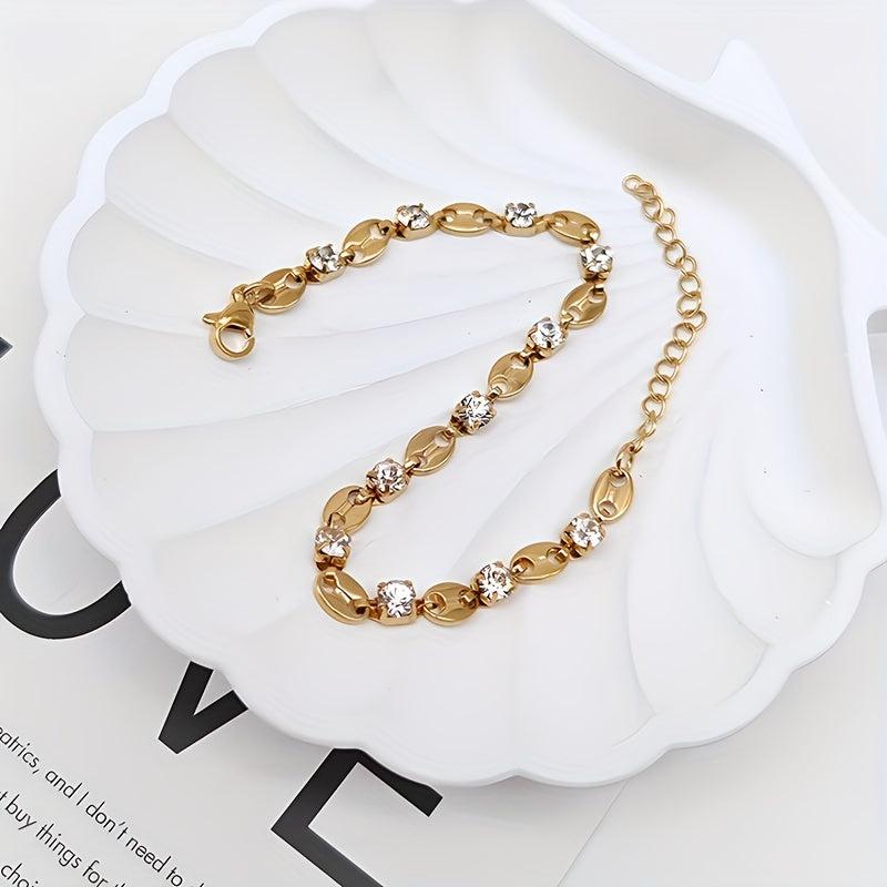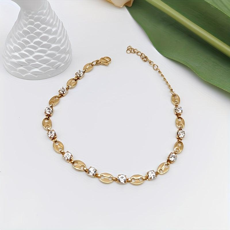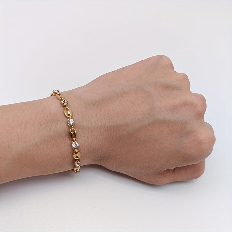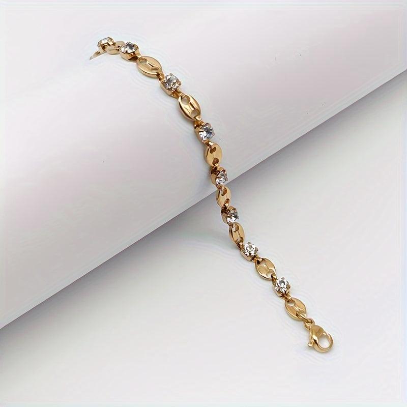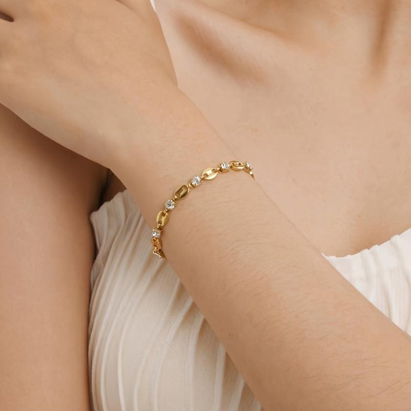 Elegant and stylish bracelet featuring zirconia-studded oval coffee bean charm with a sexy sparkle. Made of durable stainless steel link chain, perfect for daily wear and various gifting occasions.