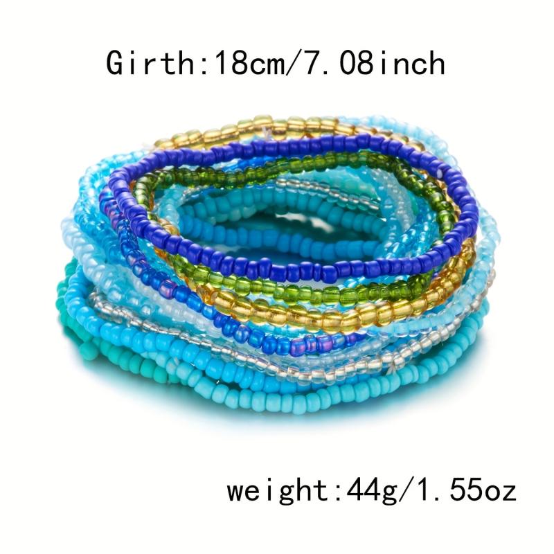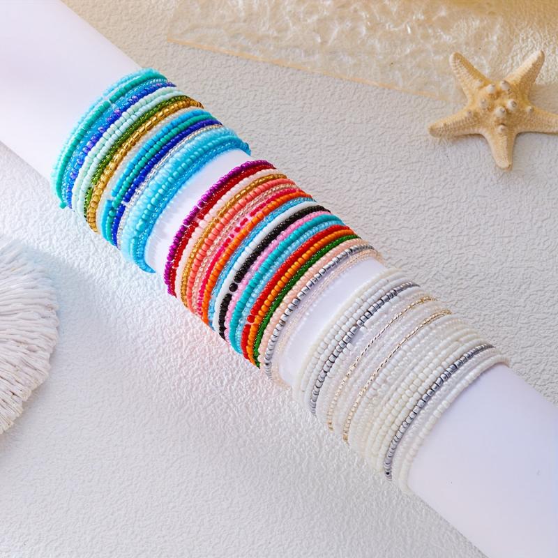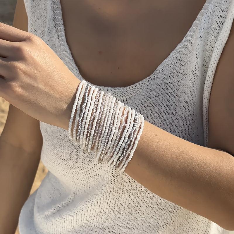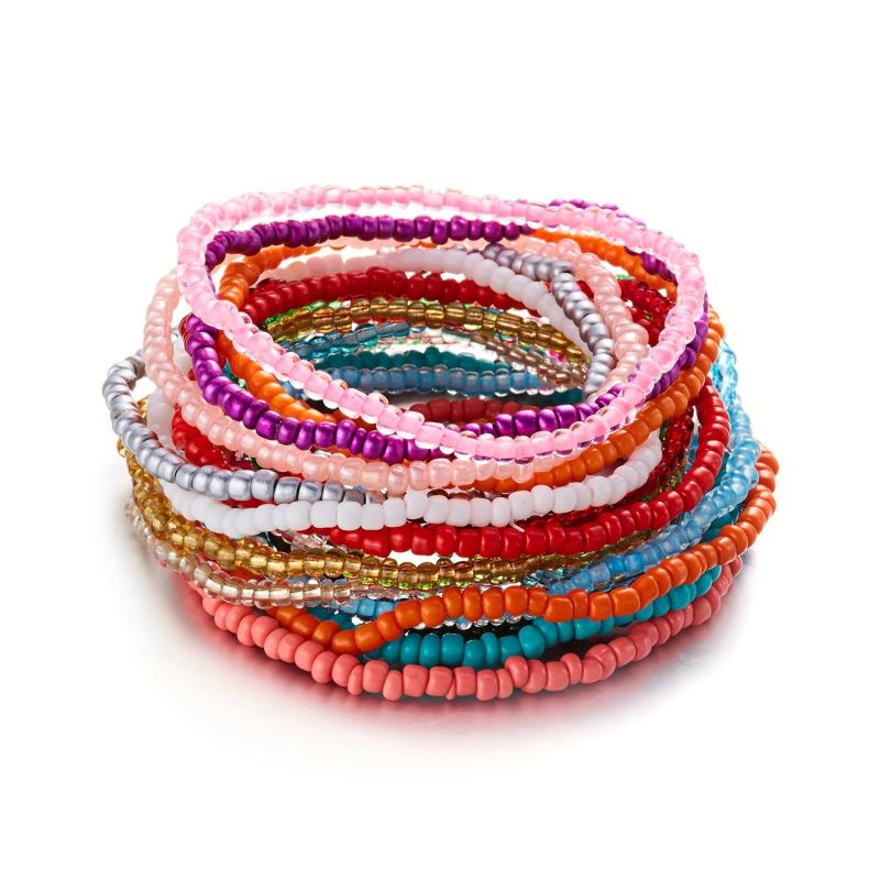 Elevate your beach look with this set of 20 colorful bohemian beaded stretch bracelets featuring contrasting dopamine rice bead accents.