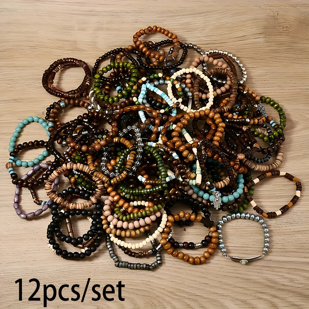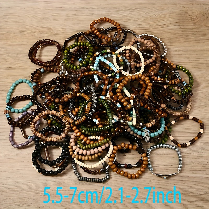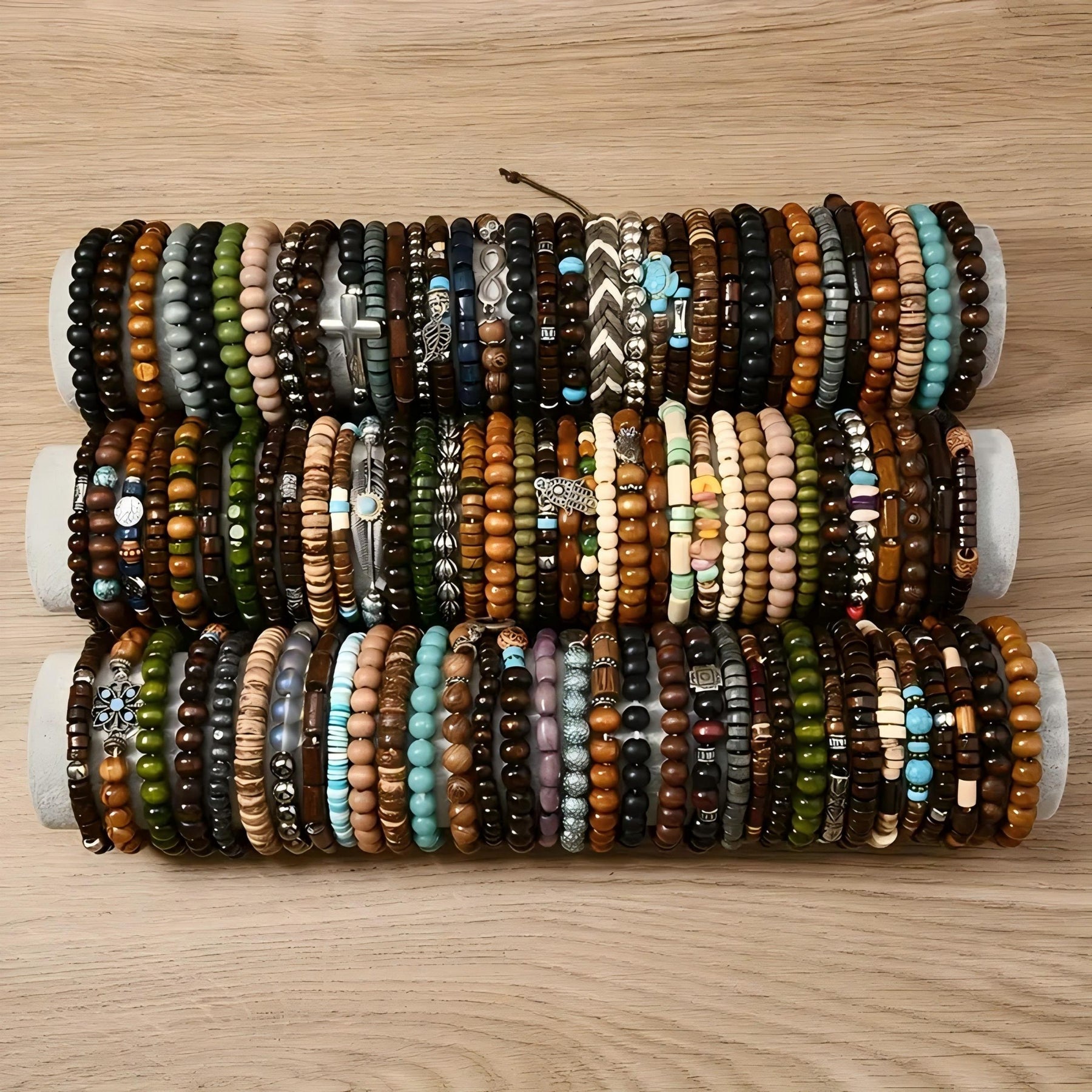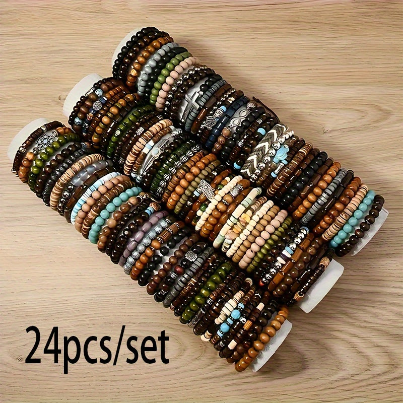 This set includes 24 wooden beaded bracelets with mixed geometric patterns. Each bracelet is adjustable and features an elastic band for easy wear. Perfect for men of all ages.