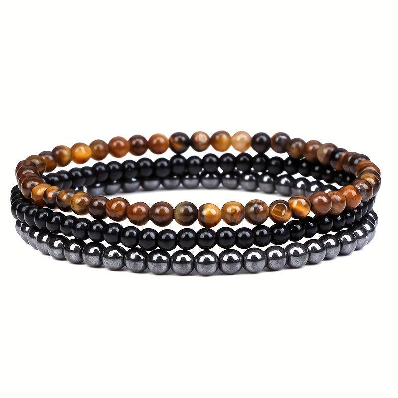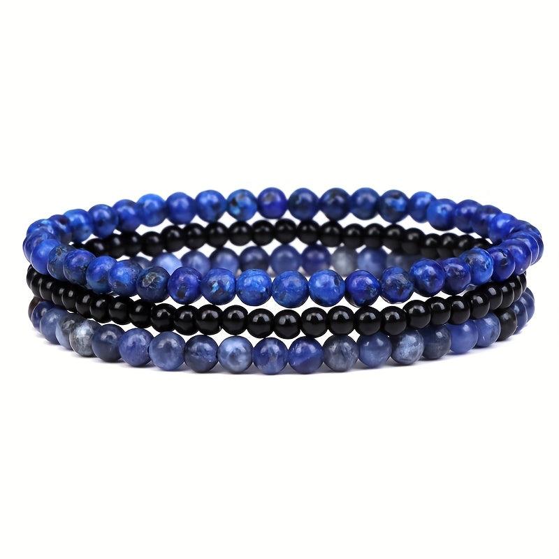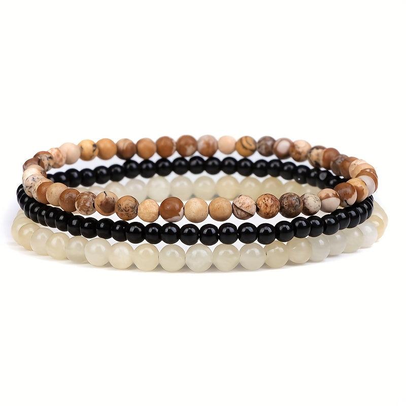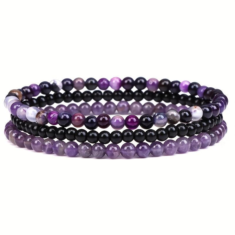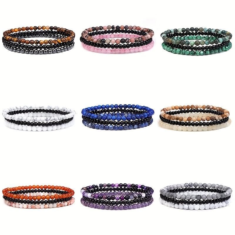 This set includes 3 bracelets made of 4mm natural stones, perfect for women and men. Ideal for couples, these bracelets are a great holiday gift.