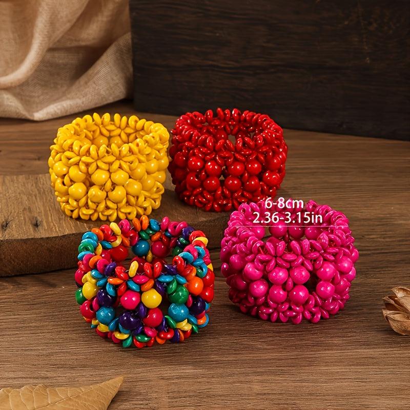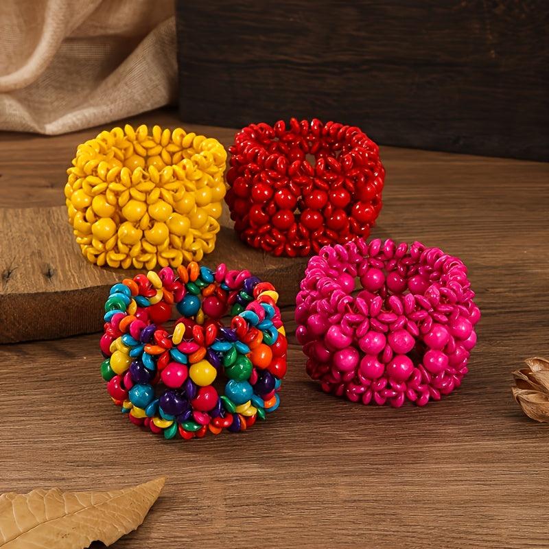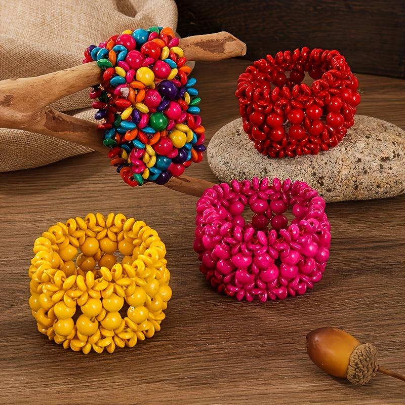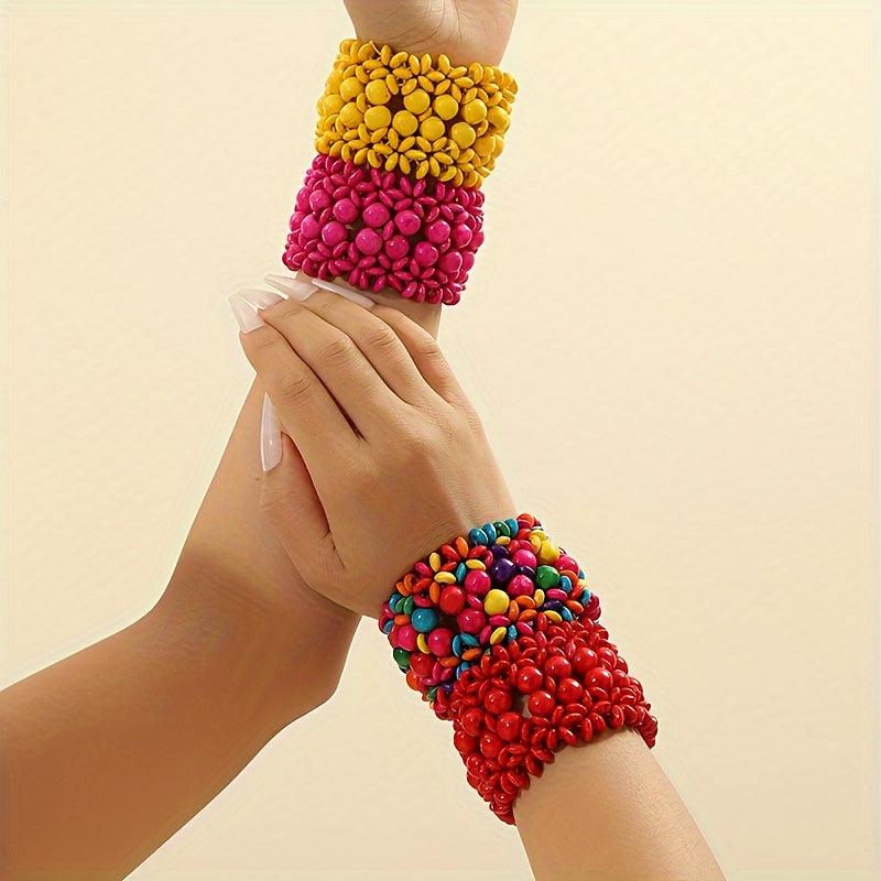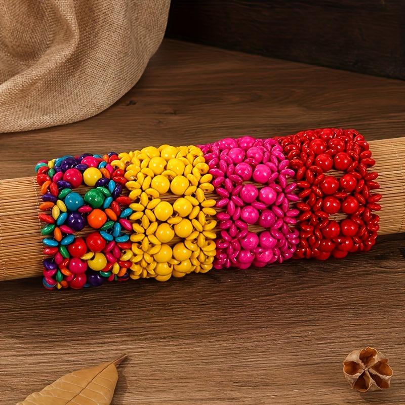 This set of bracelets features Middle Eastern and directional design elements with an exaggerated Bohemian style. Each bracelet is made of wooden beads and is elastic for easy wearing.