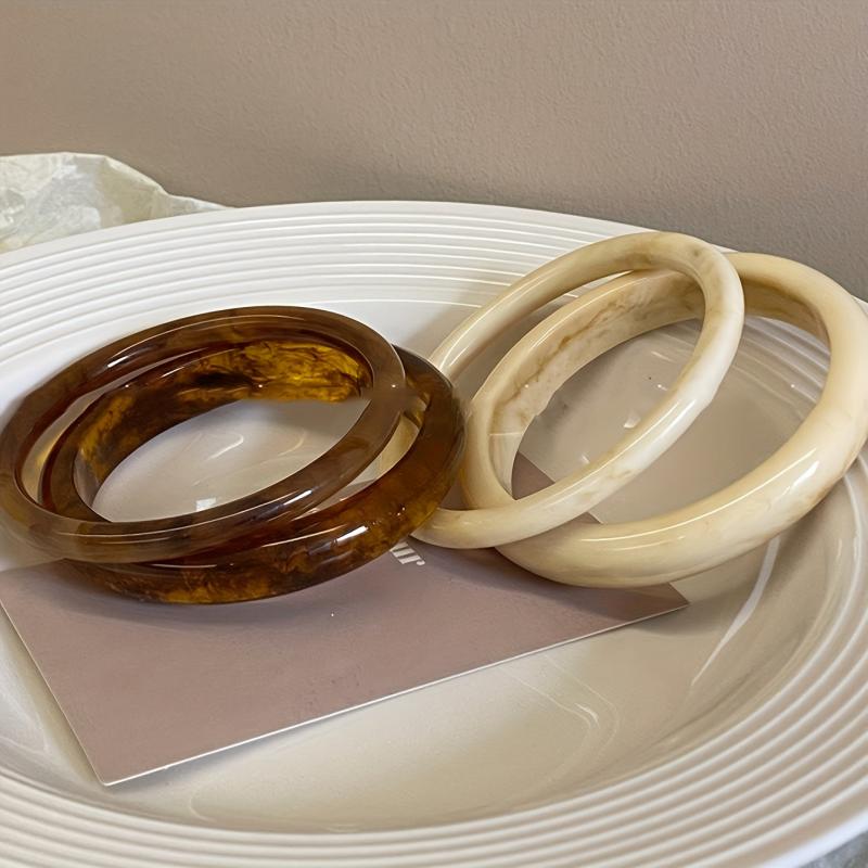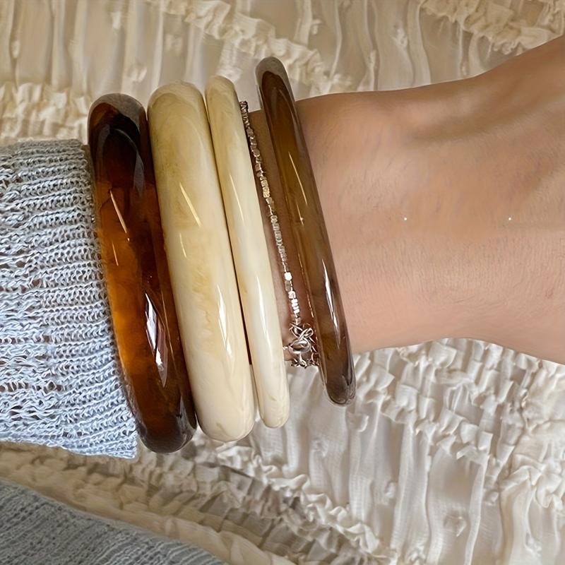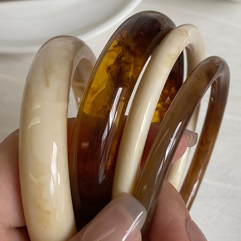 Elevate your outfit with this set of 4 vintage-inspired cuff bracelets. Made of resin and amber, these stackable bracelets are perfect for daily wear and suitable for all seasons.