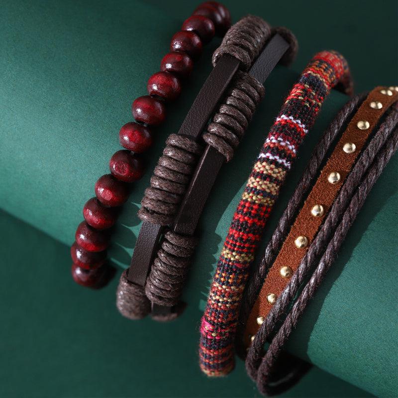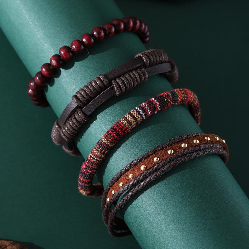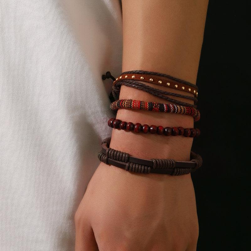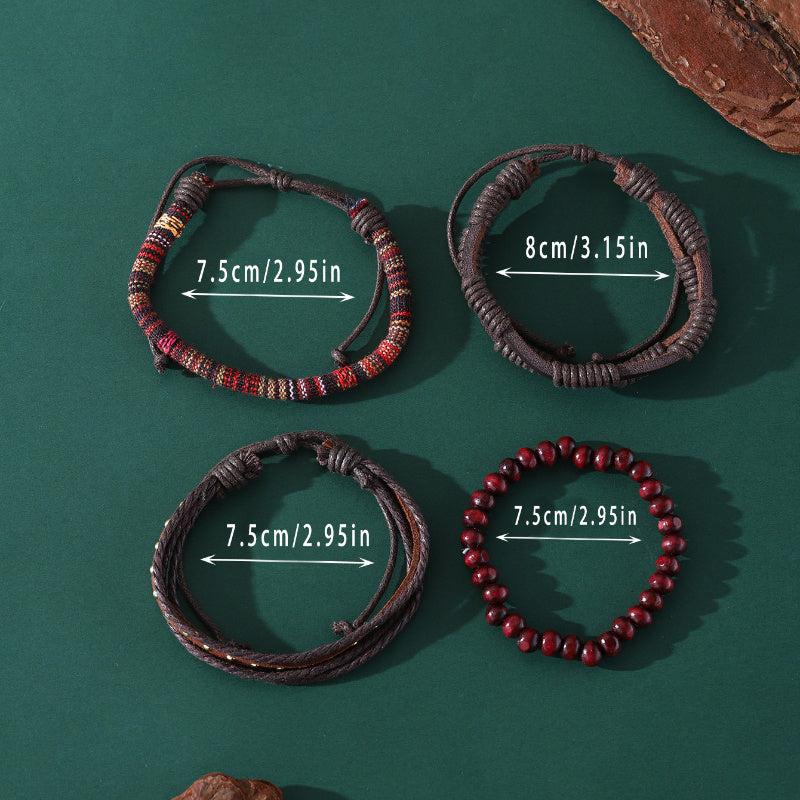 Add a touch of retro charm with this set of 4 woven cowhide bracelets featuring rosewood accents. Perfect for casual or dressy occasions.