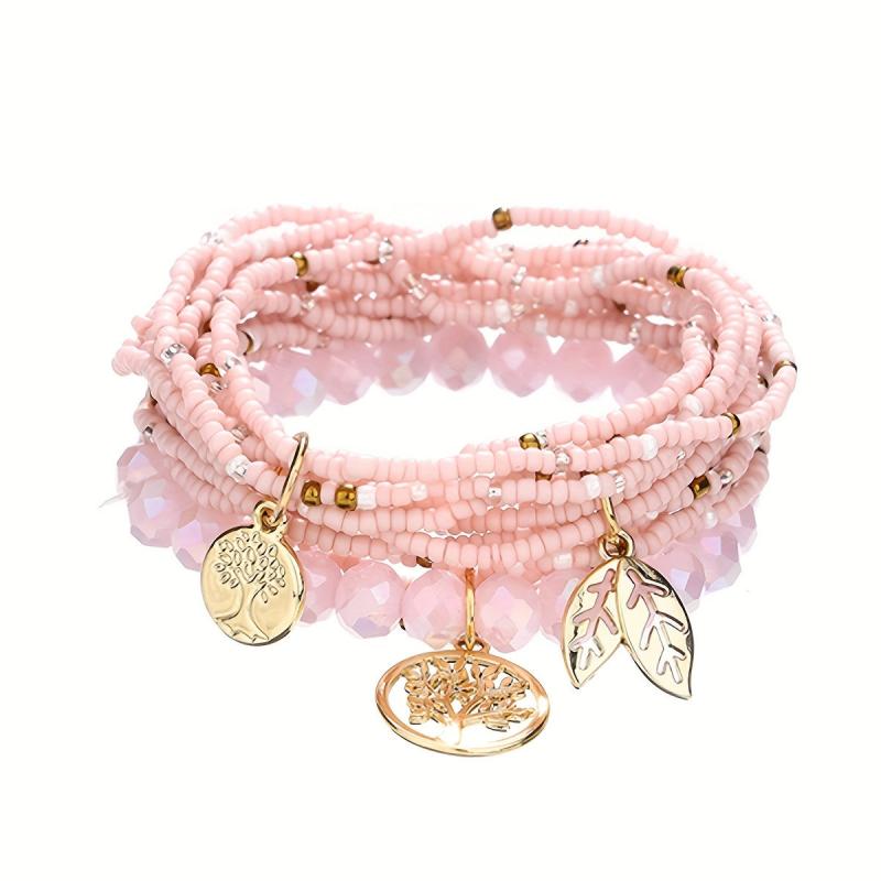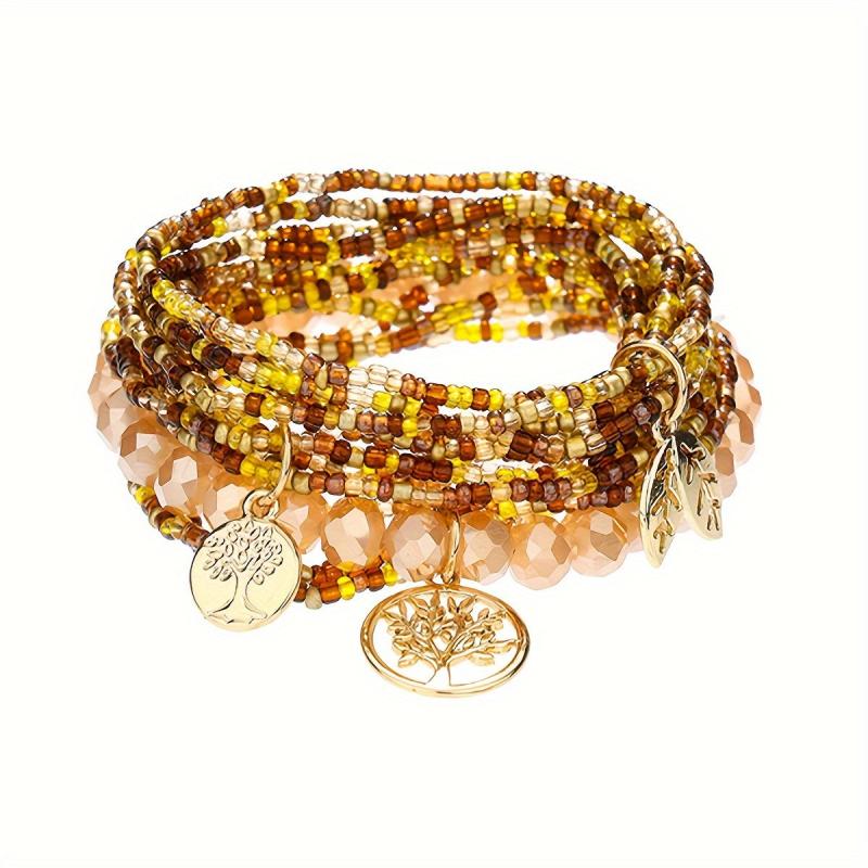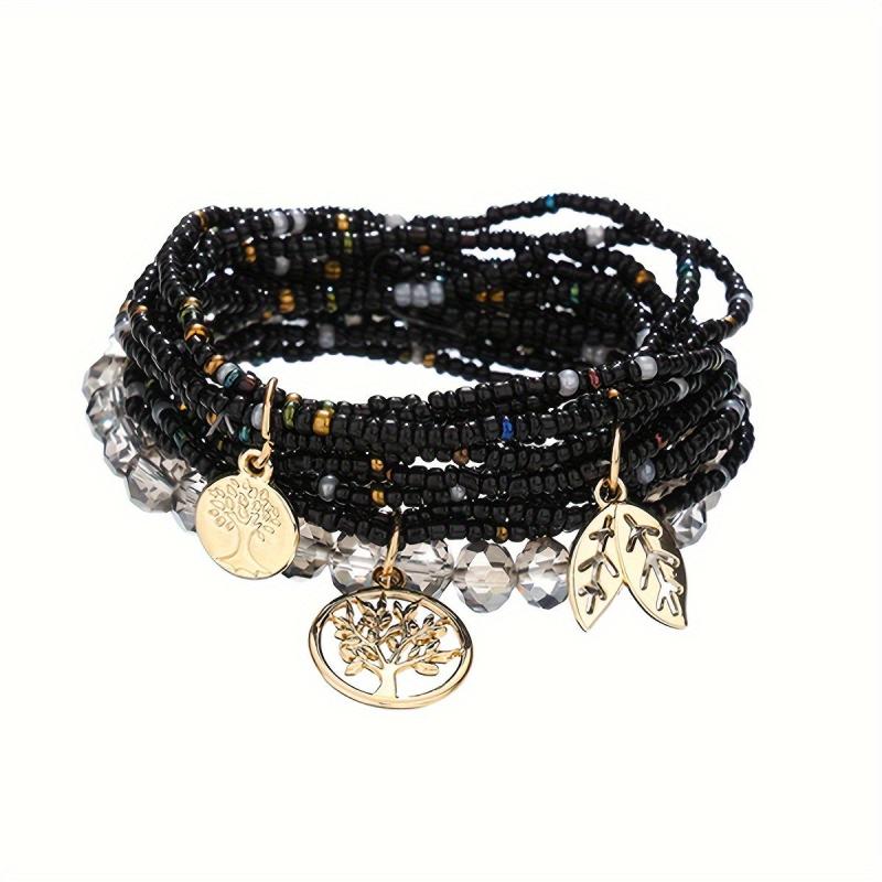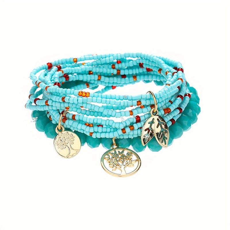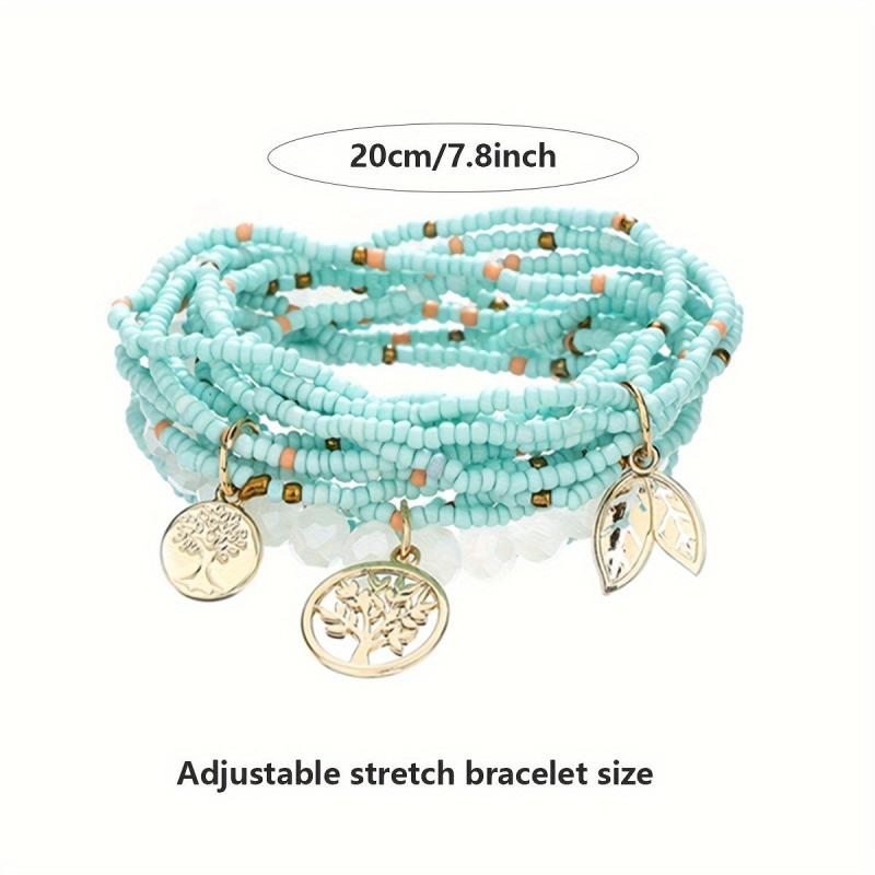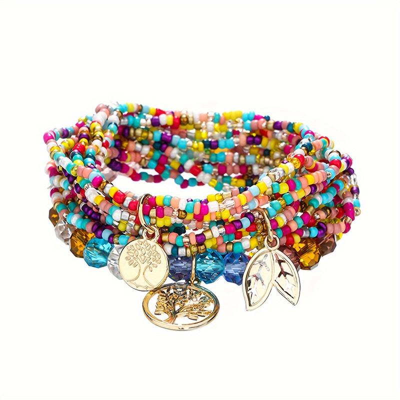 Add a touch of bohemian style to your summer look with this set of 78 layered, stacked beaded elastic bracelets. Perfect for beach vacations and surfing adventures.