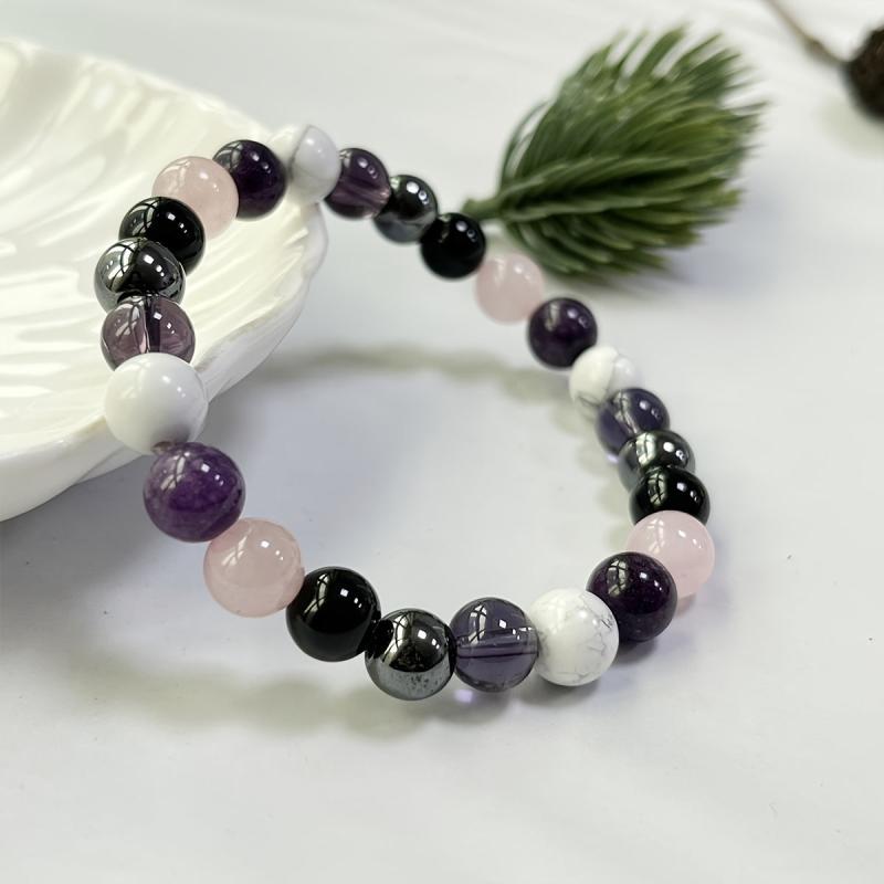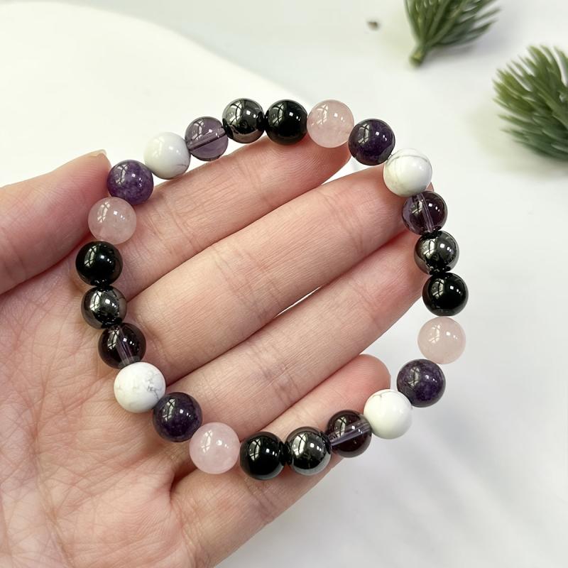 This bracelet features natural stones including amethyst, tourmaline, hematite, rose quartz, and lepidolite. It is perfect for balancing energy and promoting relaxation.