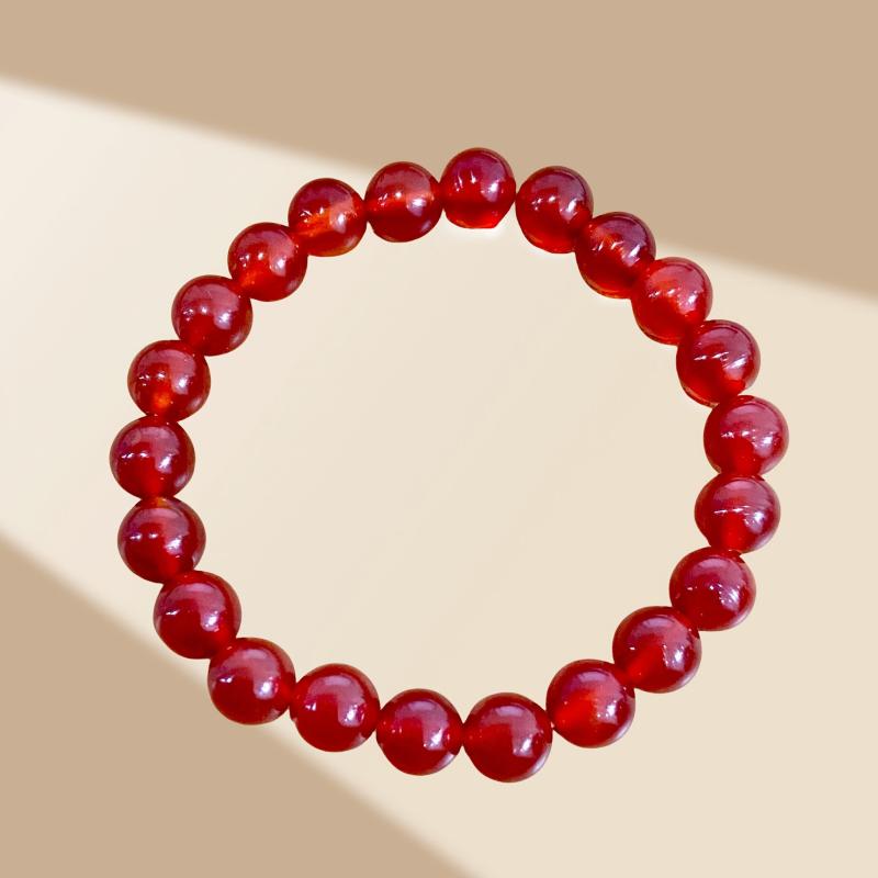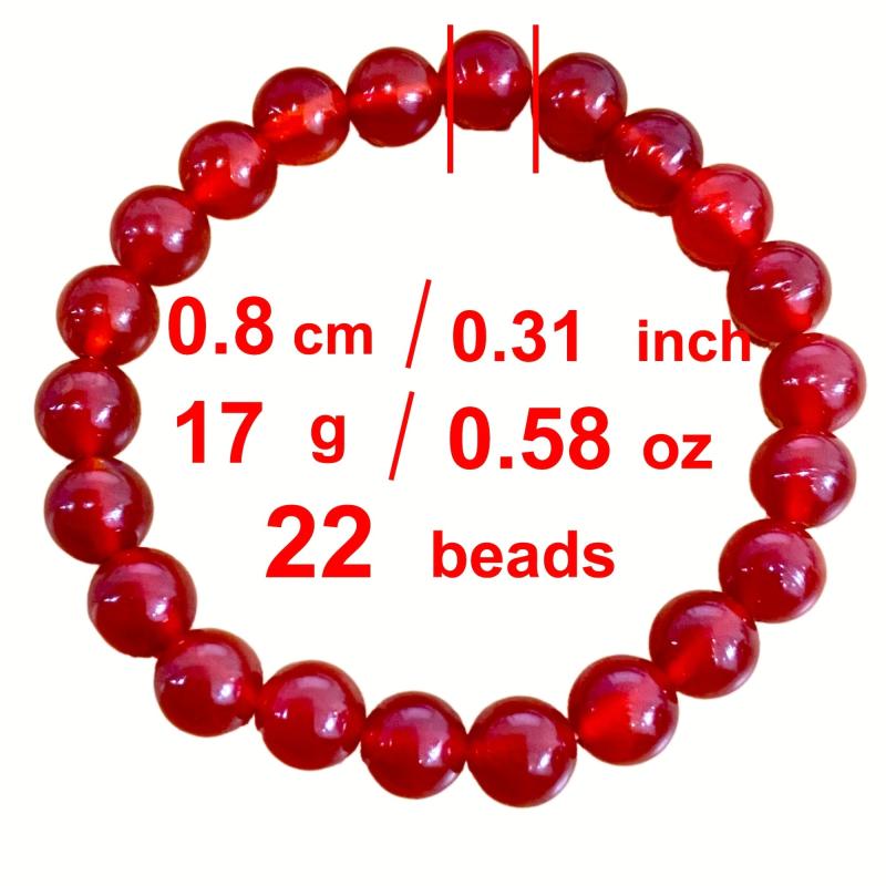 This 8mm red agate bracelet features 22 round beads that are believed to bring wealth and ward off evil. The natural agate beads are high quality and beautifully crafted.