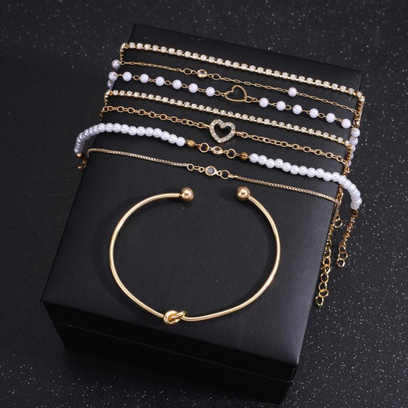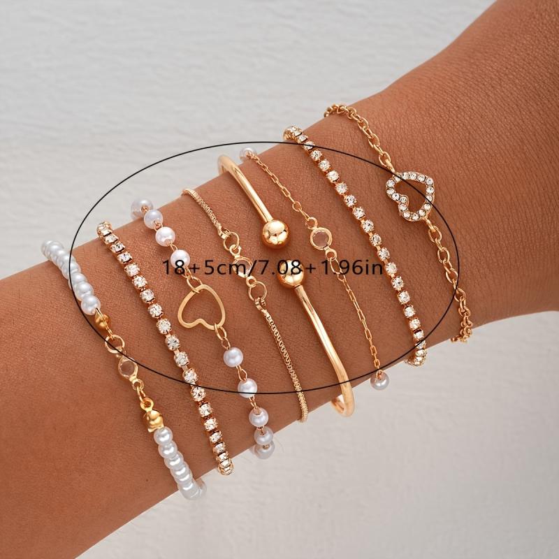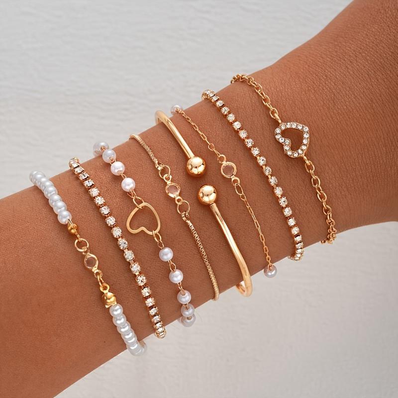 Enhance your style with this 8-piece bracelet set featuring heart charm, rhinestone, and pearl accents. Made of zinc alloy, perfect for daily or party wear.