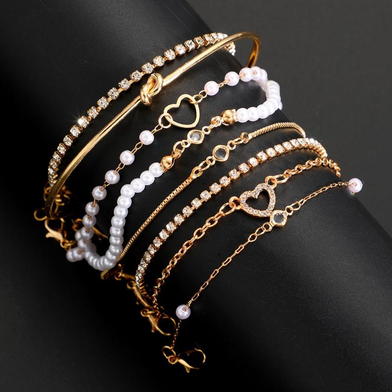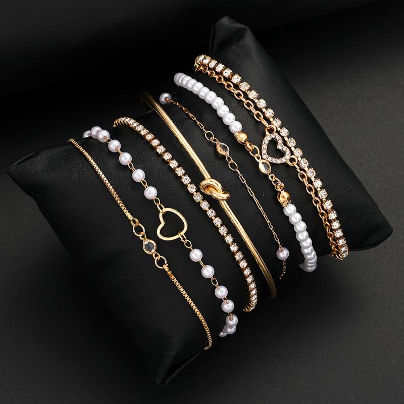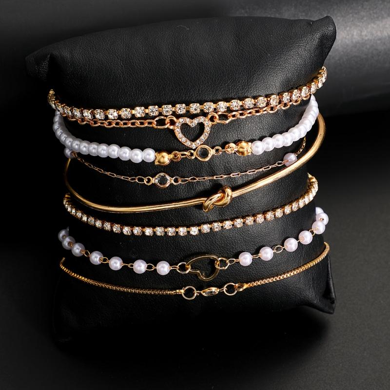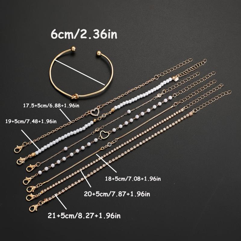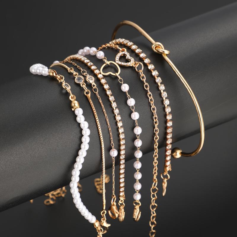 This 8-piece bracelet set features faux pearls and rhinestones on a golden-toned snake chain and beaded designs, perfect for daily wear, parties, and dates. A versatile accessory piece.