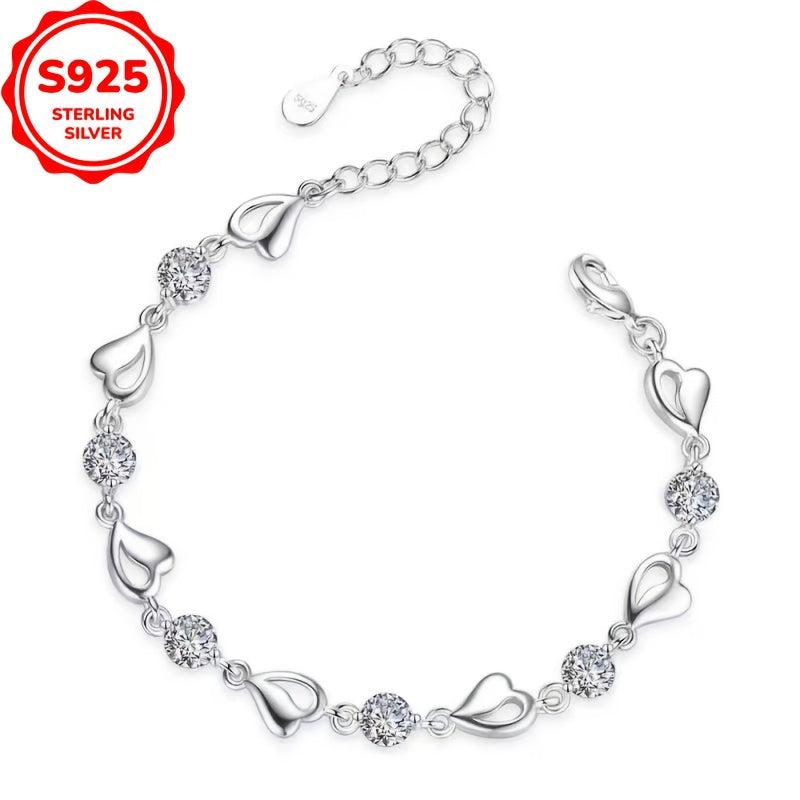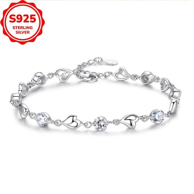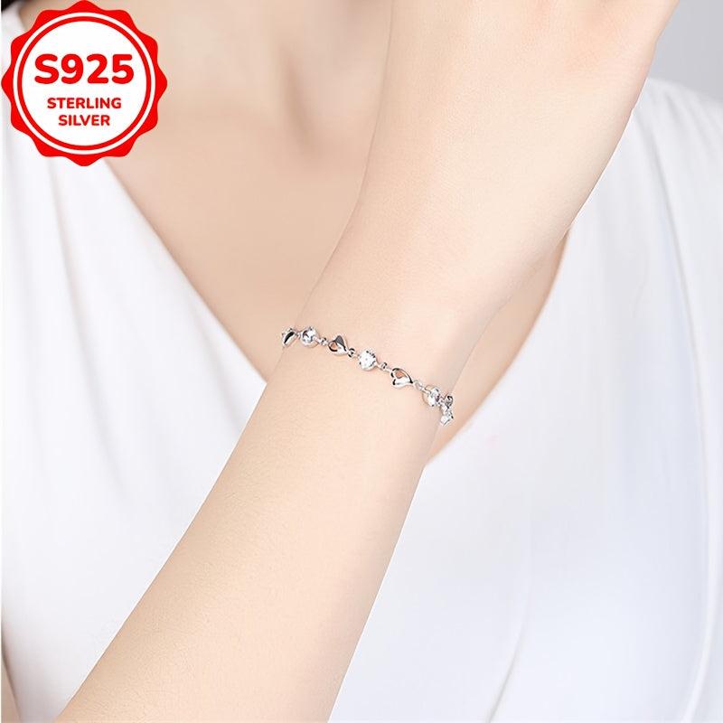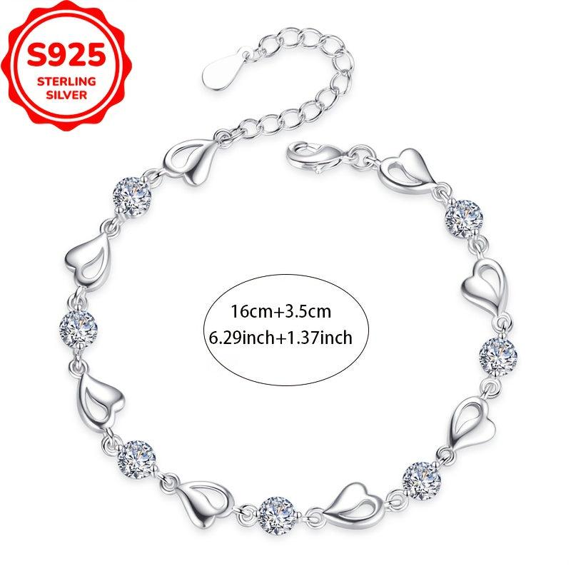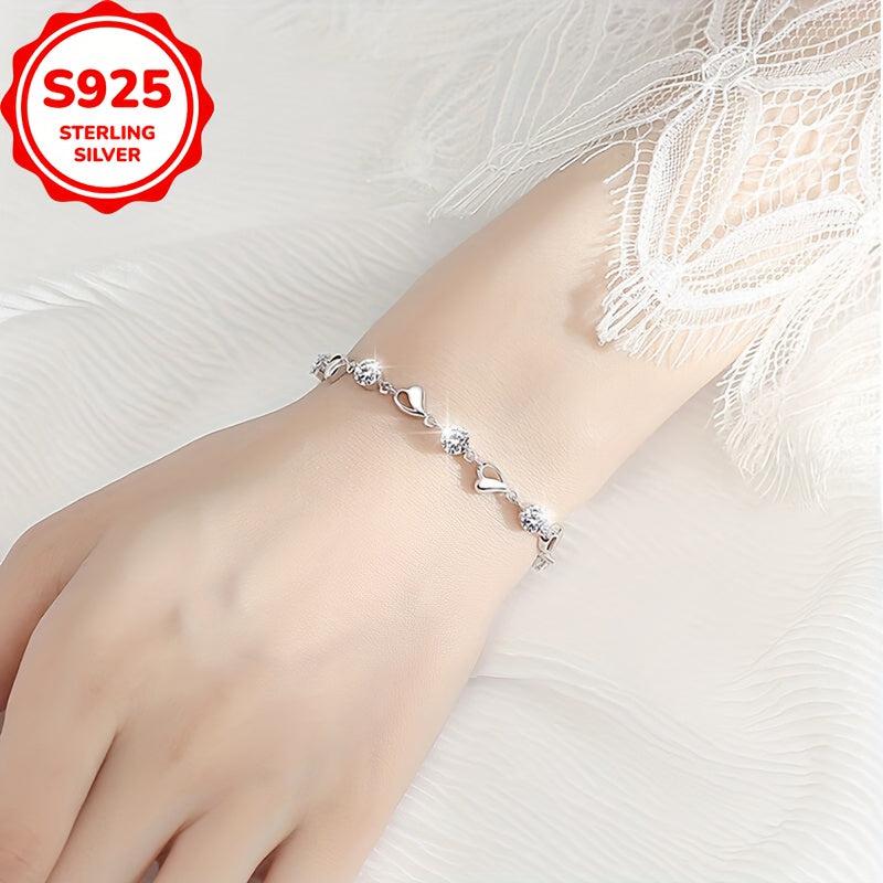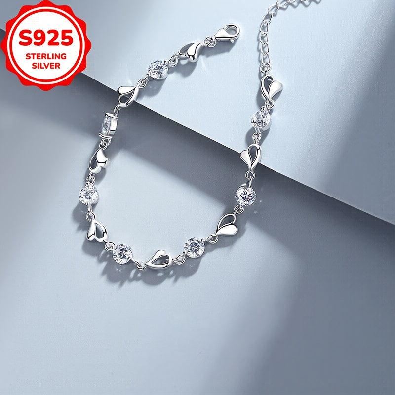 This 925 sterling silver bracelet features a heart chain design adorned with sparkling cubic zirconia stones. It's lightweight, personalized, and perfect for everyday wear or as a thoughtful gift.