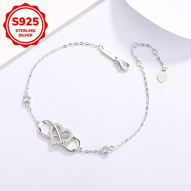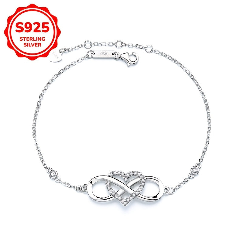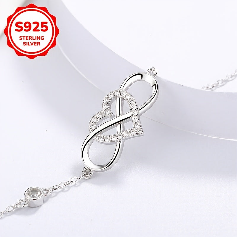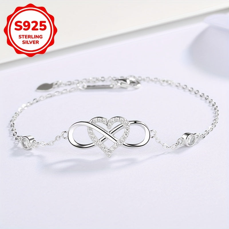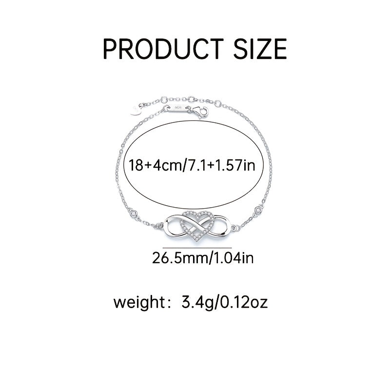 This women's bracelet showcases a unique 8-shaped heart design crafted from 925 silver. It is lightweight at 3.4g and ideal for daily wear or as a romantic gift on Valentine's Day.