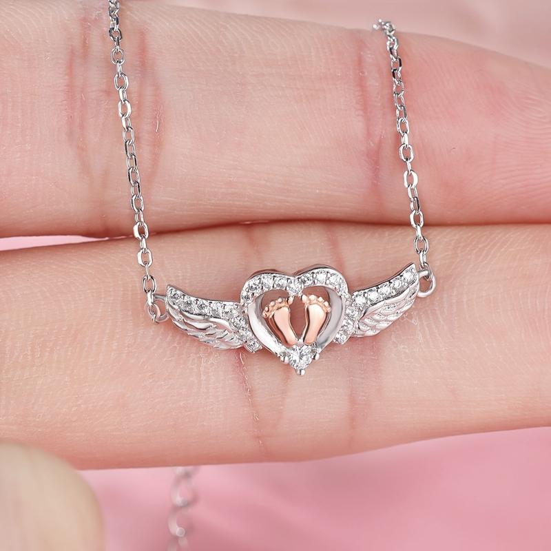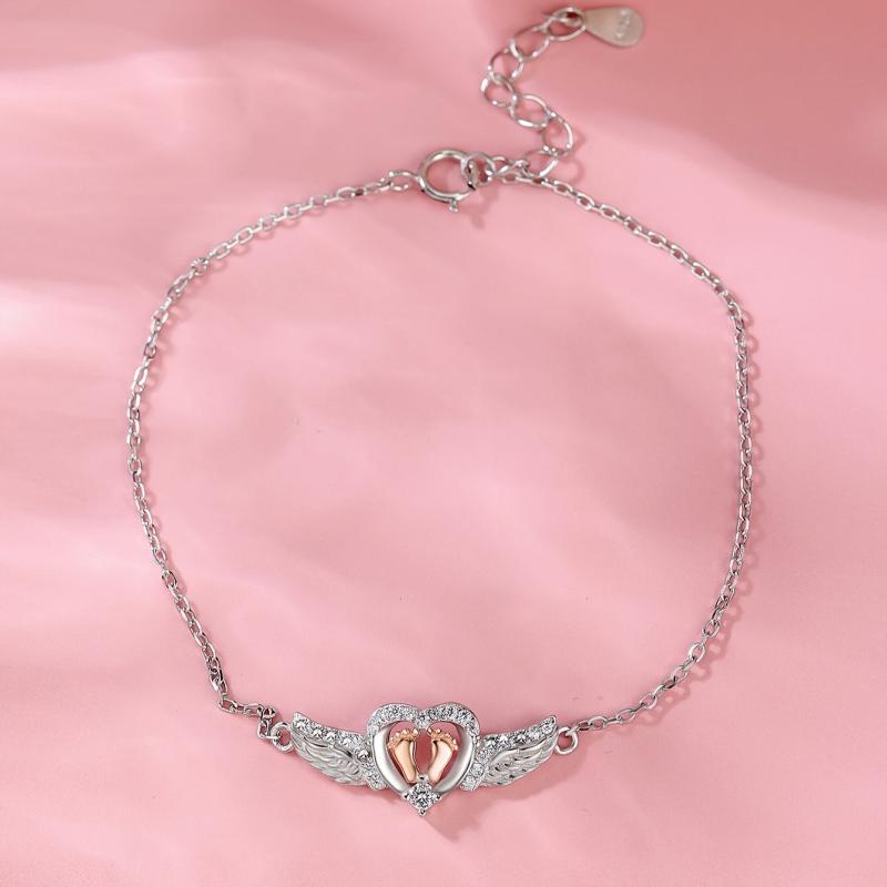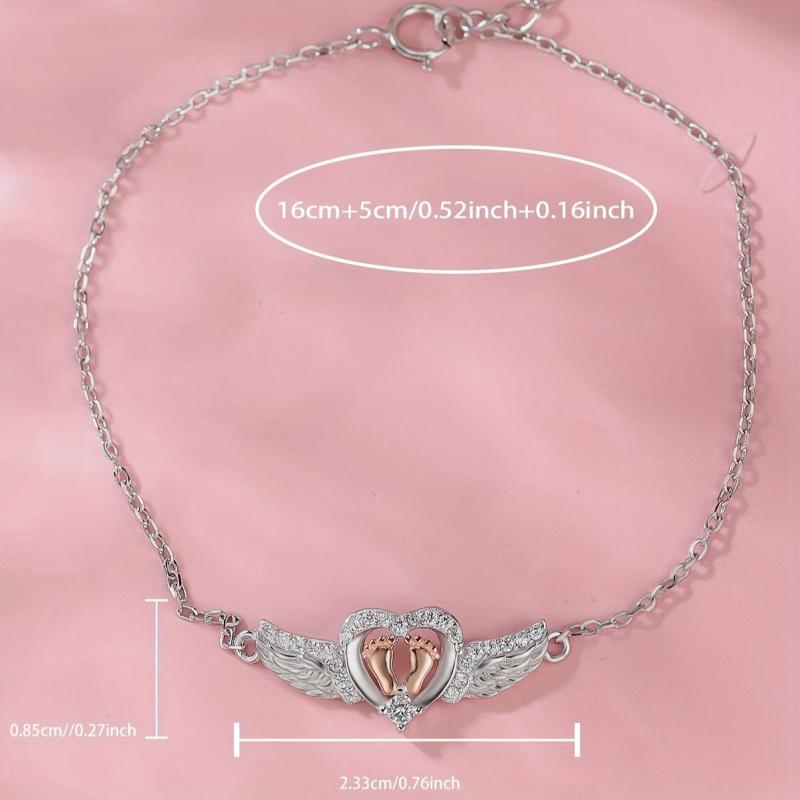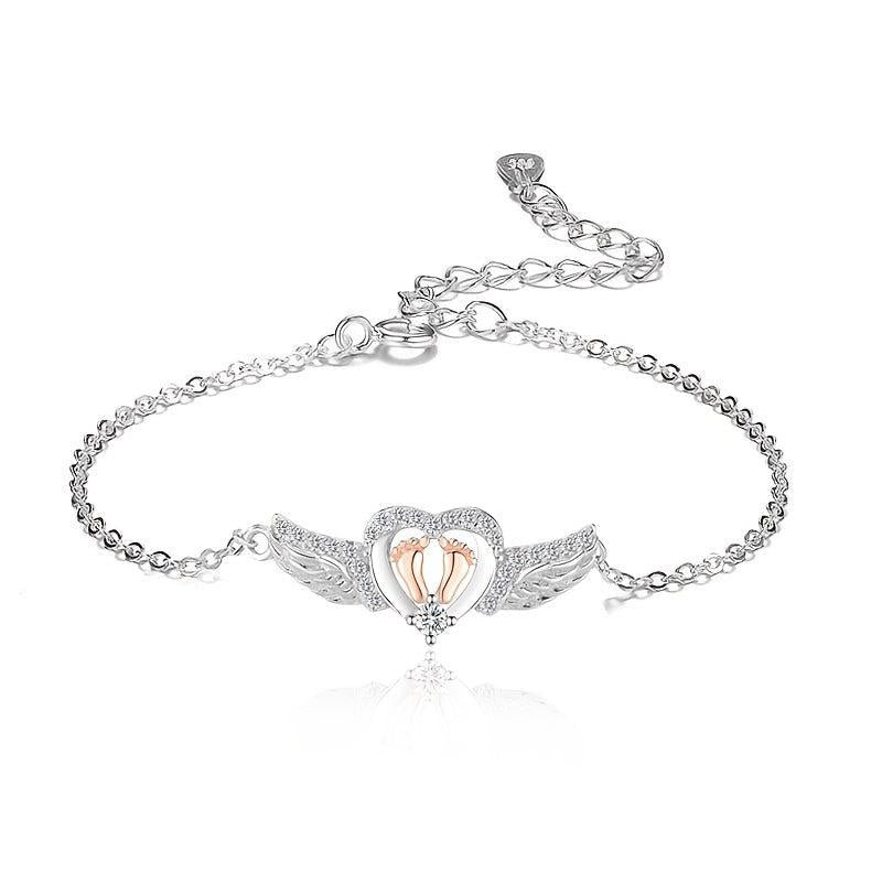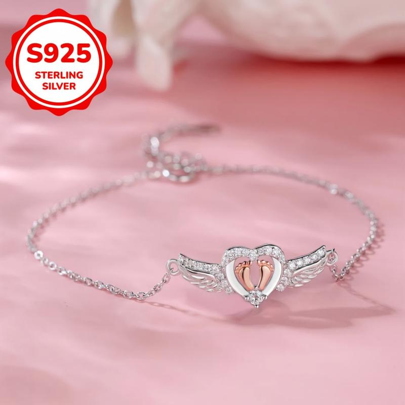 Beautiful vintage style bracelet made of 925 sterling silver with 'Mommy of an Angel' engraving. Features children's feet and heart charms with cubic zirconia accents, making it a perfect gift for mothers.