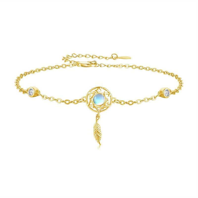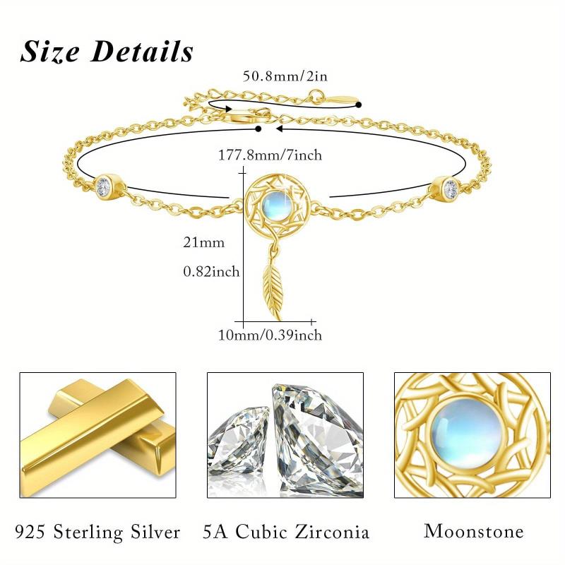 This stunning 925 sterling silver dream catcher bracelet features an artificial moonstone and feather chain. Adjustable design to fit any wrist size.