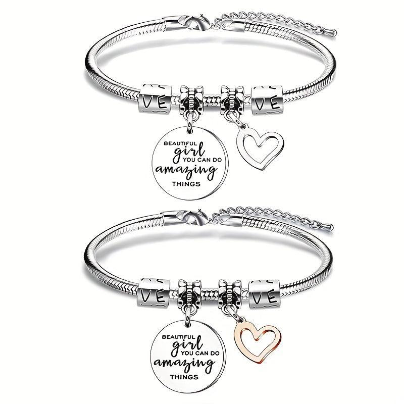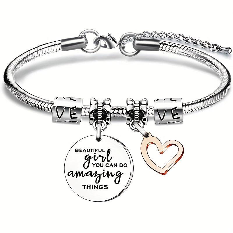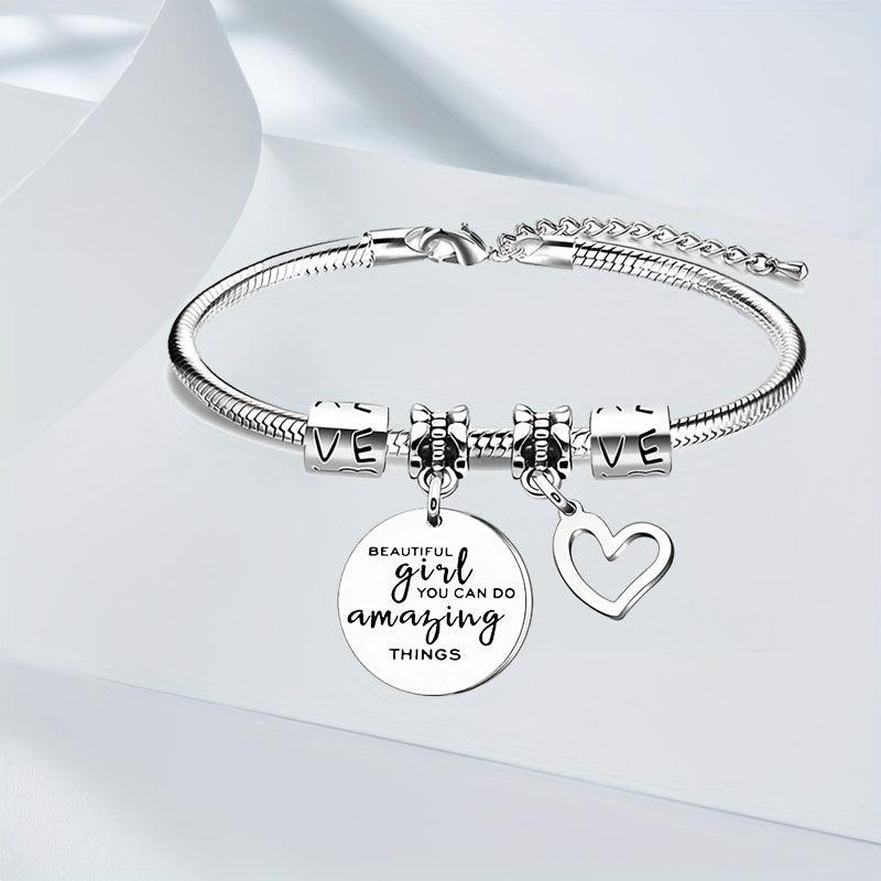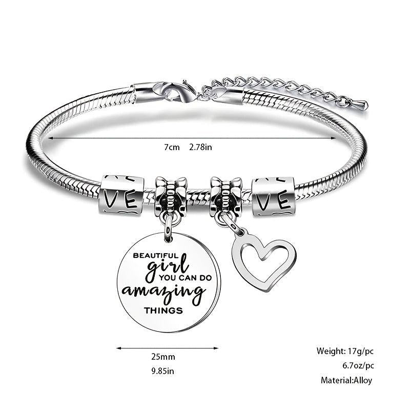 This stainless steel charm bracelet features a hollow heart shape pendant. Makes a perfect birthday present or gift for any occasion.