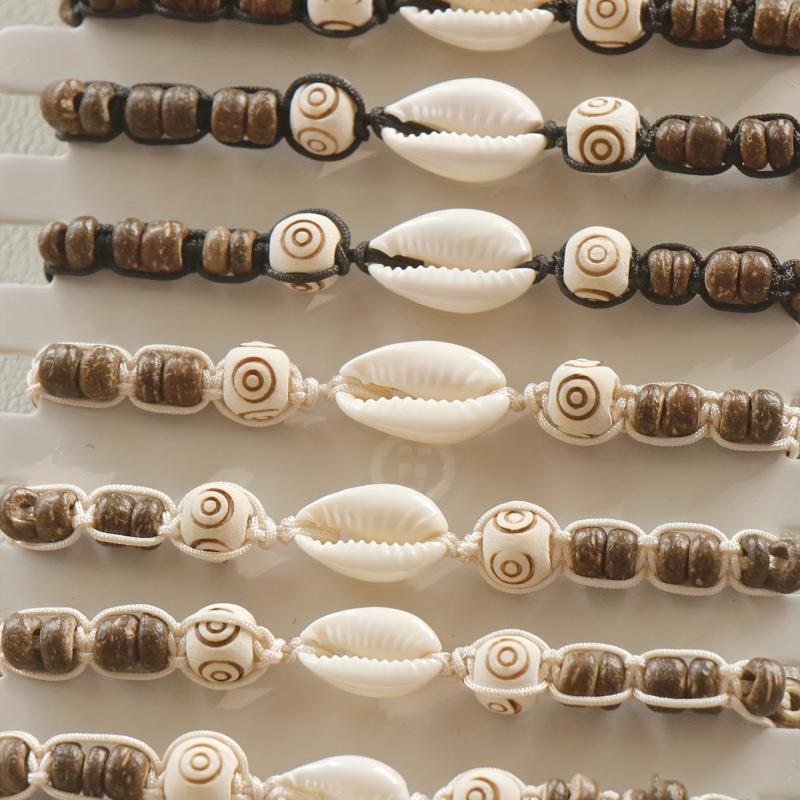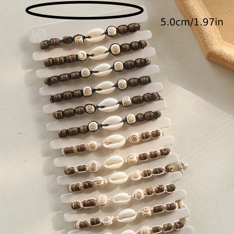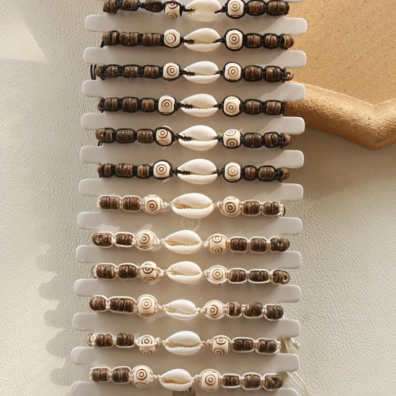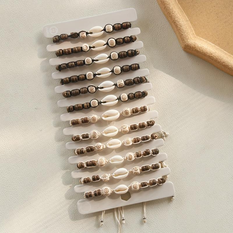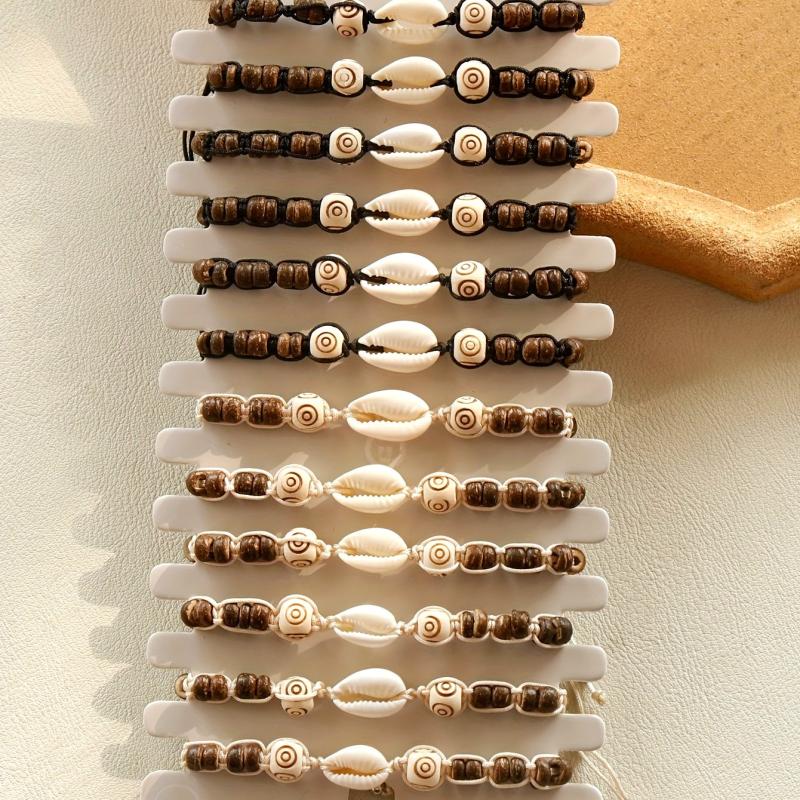 This set includes 12pcs of summer-themed bracelets made with wooden beads and shell accents. Each bracelet is adjustable to fit different wrist sizes, perfect for couples or friends to wear together.