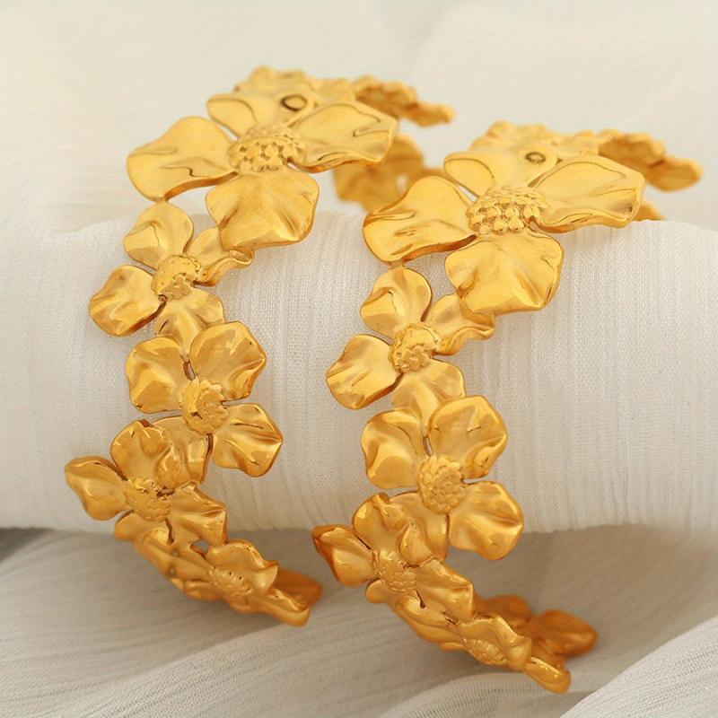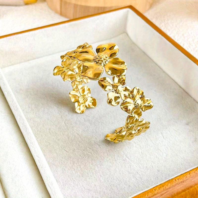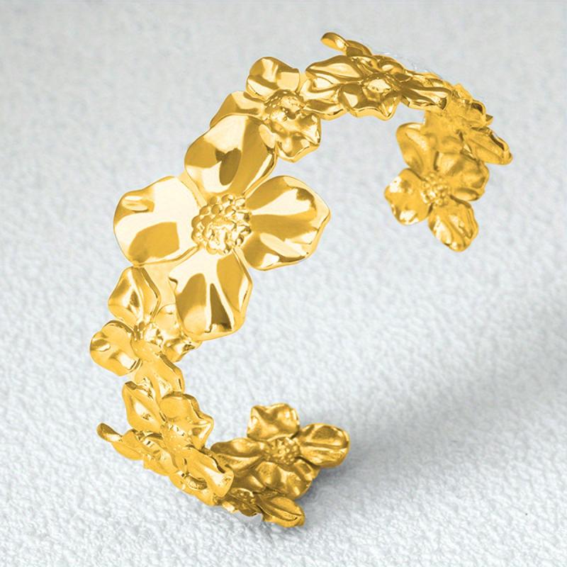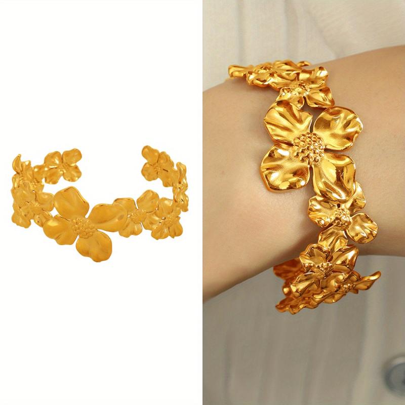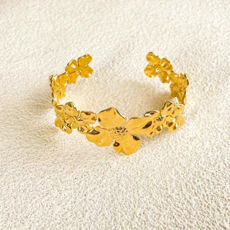 Elegantly designed open cuff bracelet with intricate floral detailing in a metallic finish. Versatile accessory perfect for casual attire or parties.