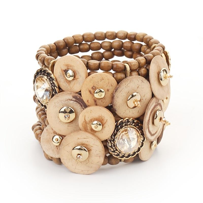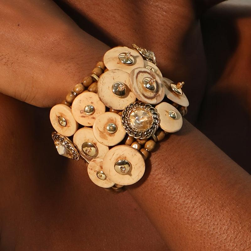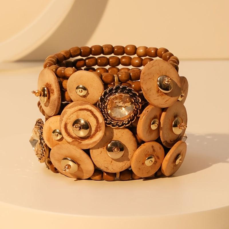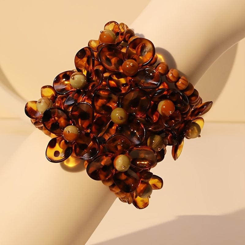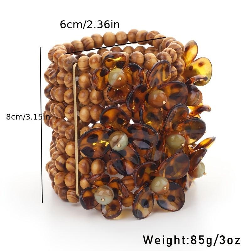 This stunning bracelet combines amber-colored floral beads with a mix of wood and resin layers, making it perfect for daily wear or gifting.