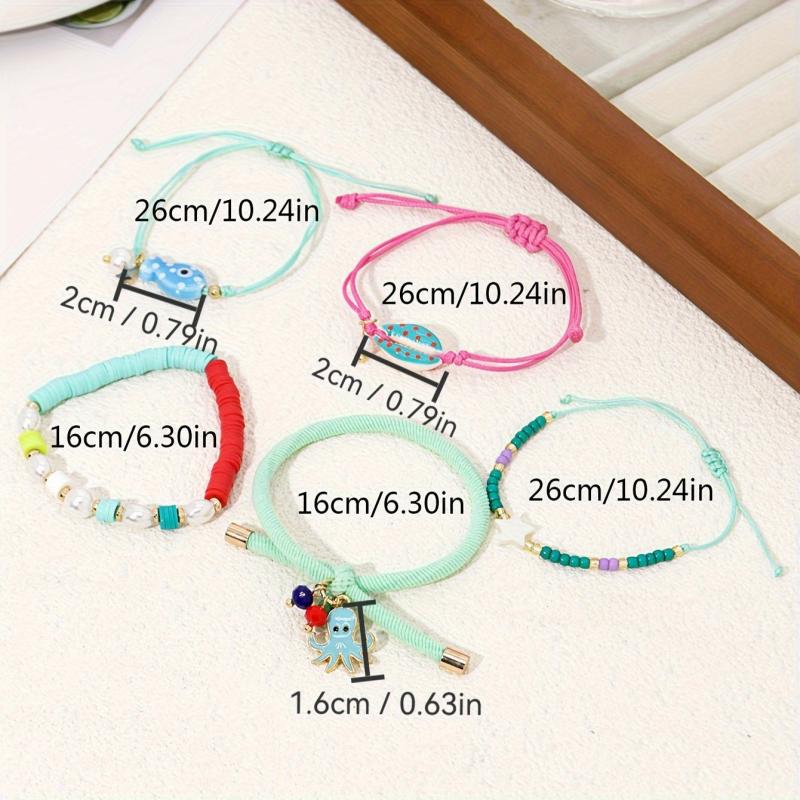 Add a touch of bohemian flair to your outfit with this 5-piece bracelet set. Featuring mixed glass, fish, shell, and octopus pendants, these bracelets are perfect for vacations, parties, and daily wear.