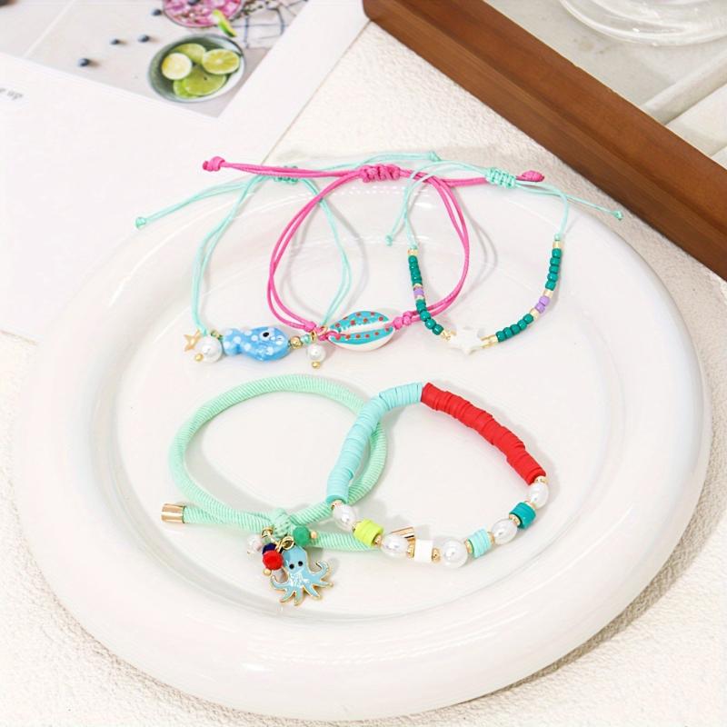 • 5-piece bracelet set with mixed glass, fish, shell, and octopus pendants