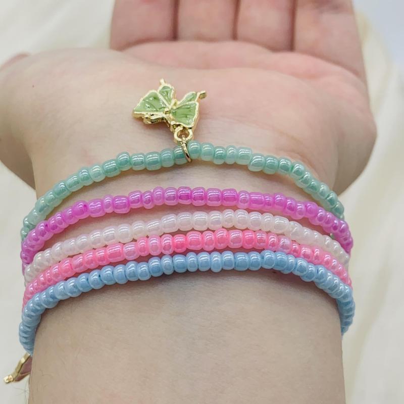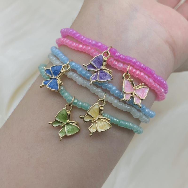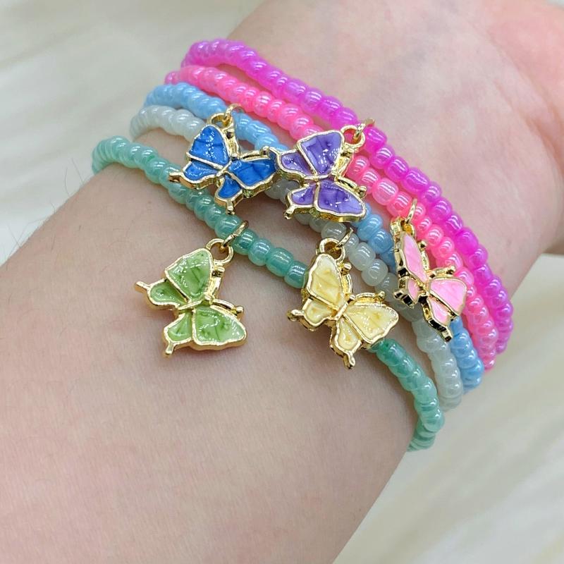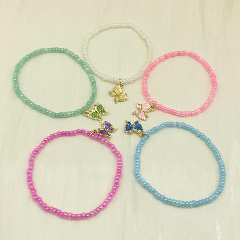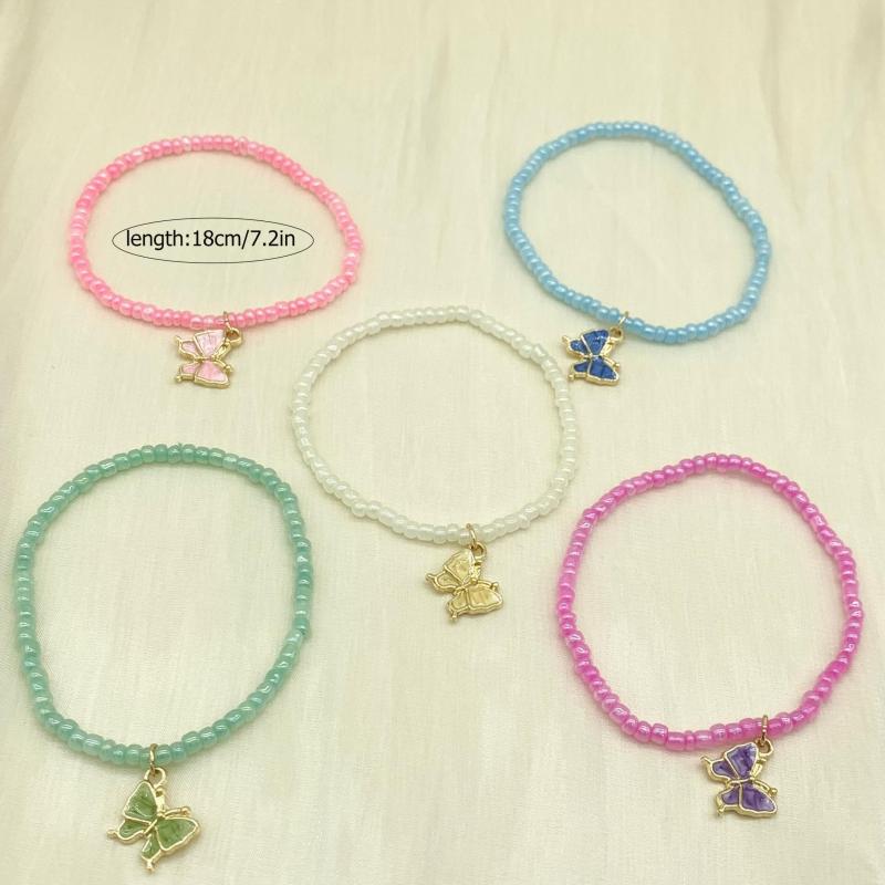 Add a touch of bohemian style to your outfit with this set of 5 colorful butterfly charm bracelets. Each bracelet features golden tone spacers and multicolor beads on elastic stretch bands. Perfect for casual attire or as a gift idea.