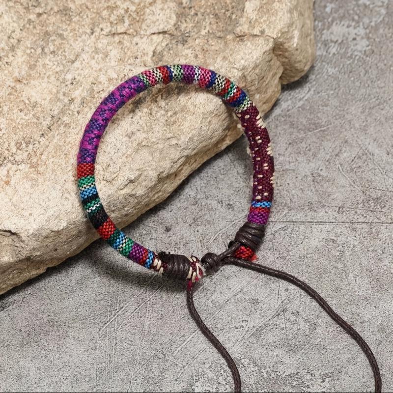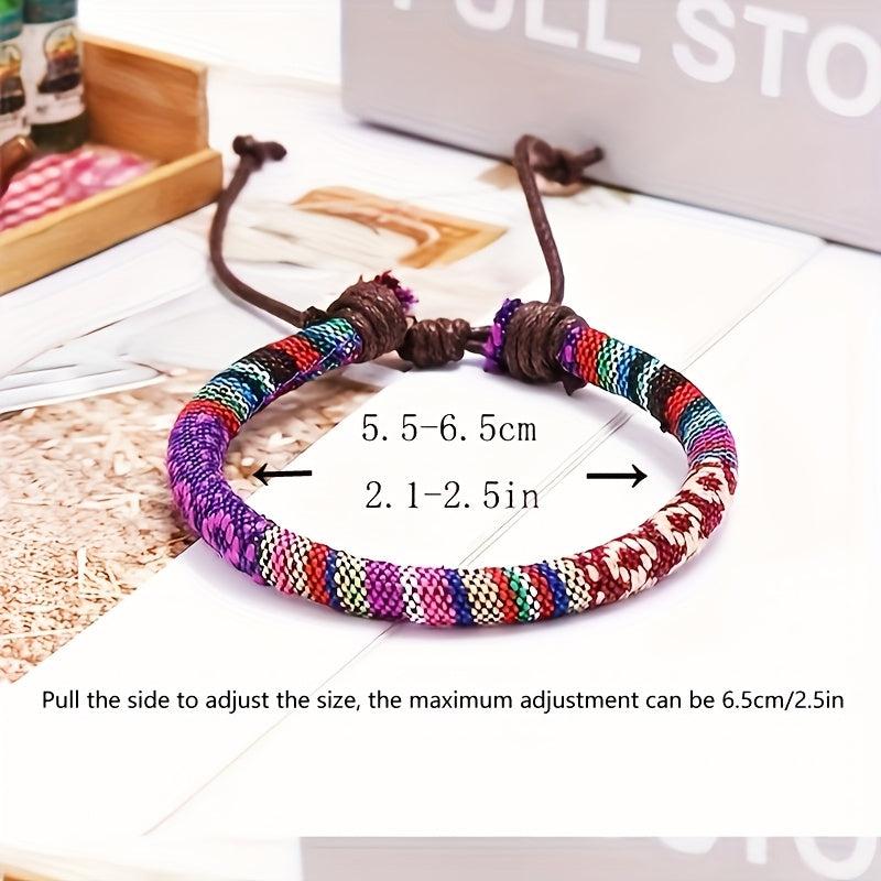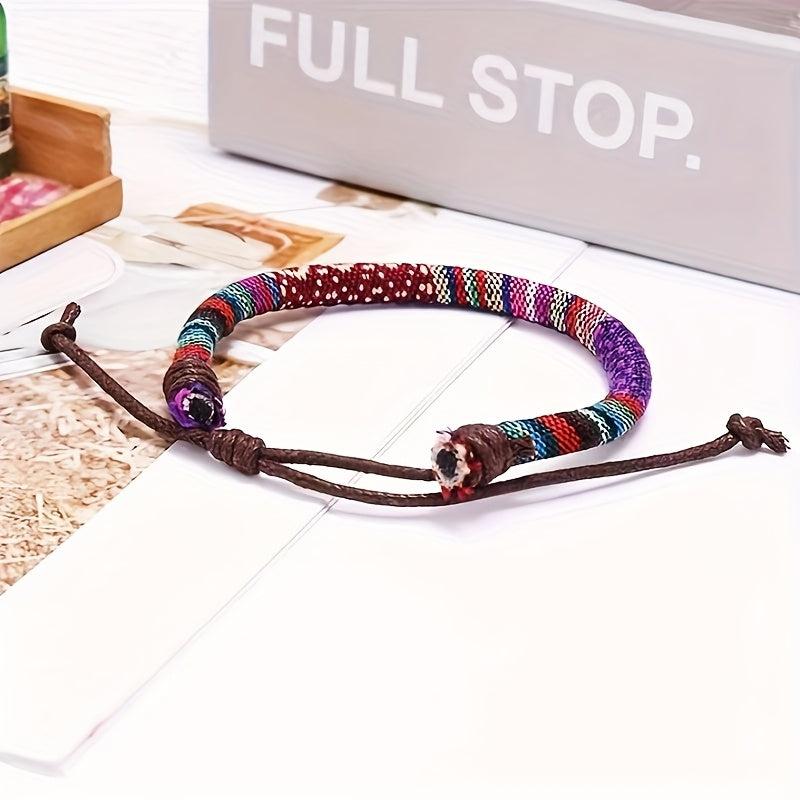Add a touch of bohemian style to your look with this ethnic woven bracelet adorned with colorful beaded straps. Perfect for daily wear or as vacation accessories.