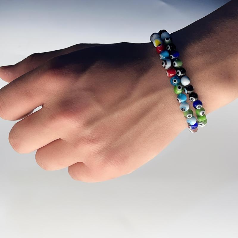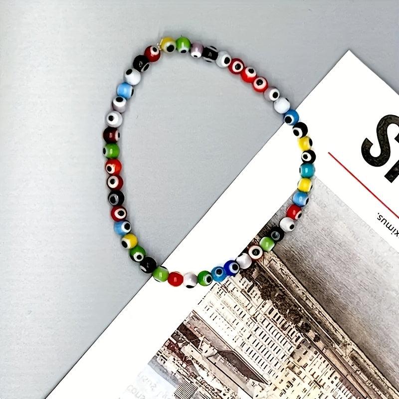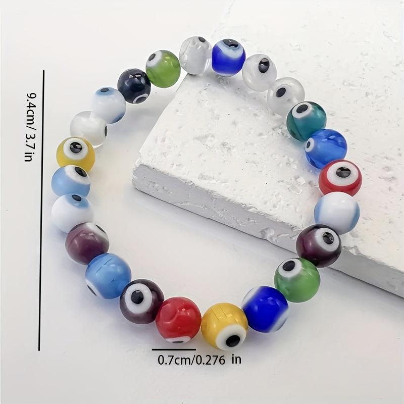 Embrace the bohemian style with this evil eye bracelet featuring intricate eye motif. The colorful glass beads add a vibrant touch to any outfit. Lightweight and perfect for parties, graduations, or everyday wear.