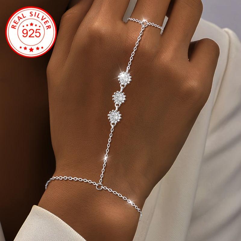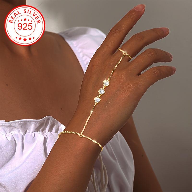 Elevate your style with this stunning ladies' ring bracelet featuring three flowers and a connected finger bracelet adorned with sparkling cubic zirconia. Crafted in a bohemian style.