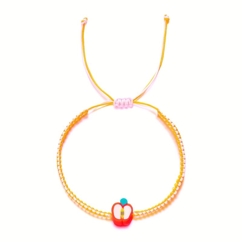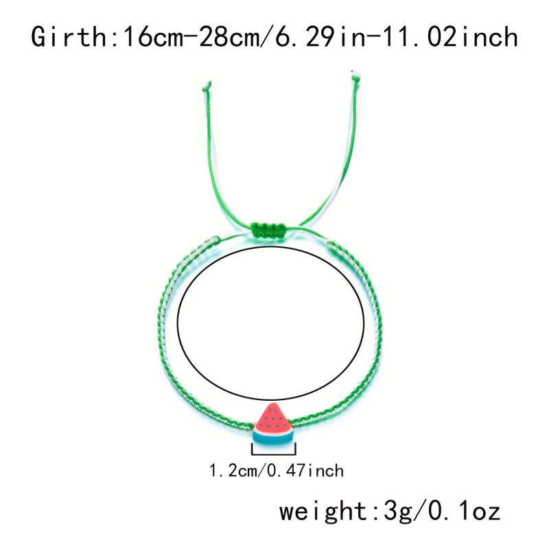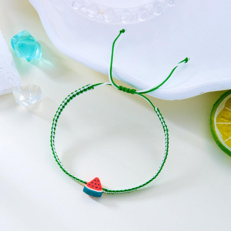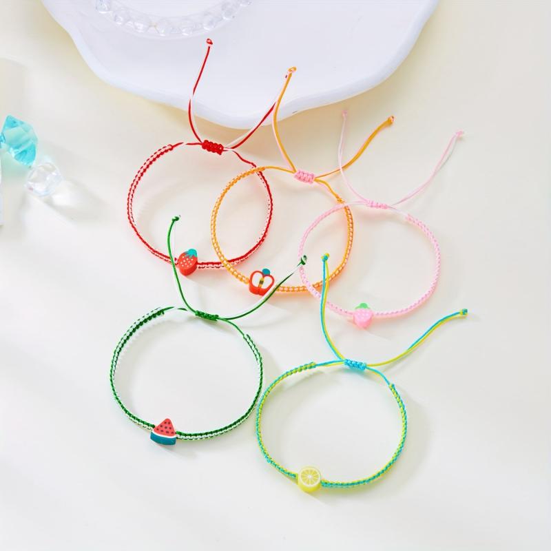 Colorful strawberry, watermelon, and lemon charm bracelets made of soft polyester fiber. Lightweight, stretchy, and perfect for everyday wear.