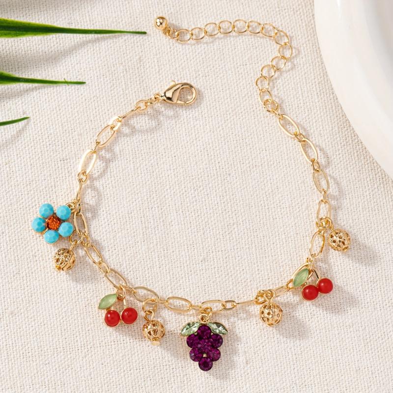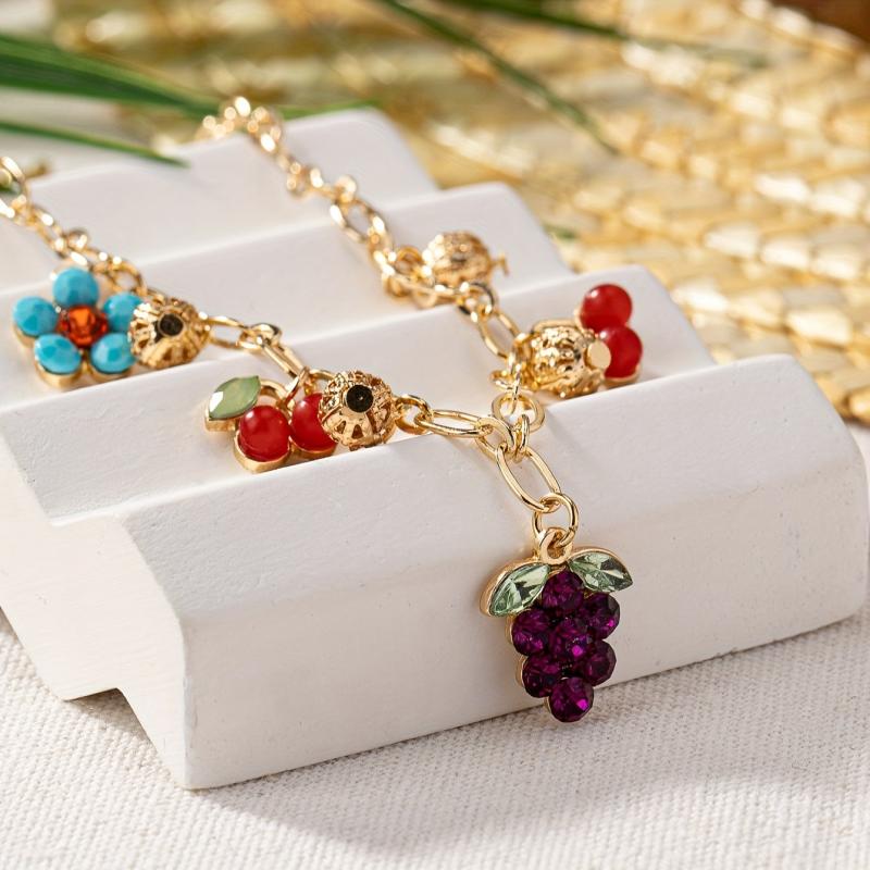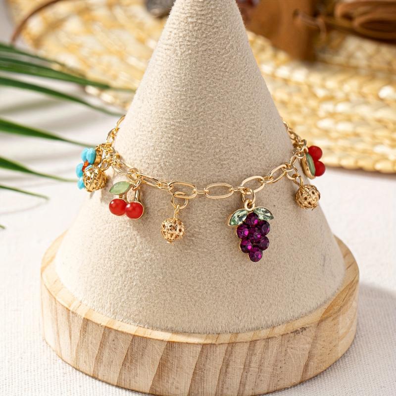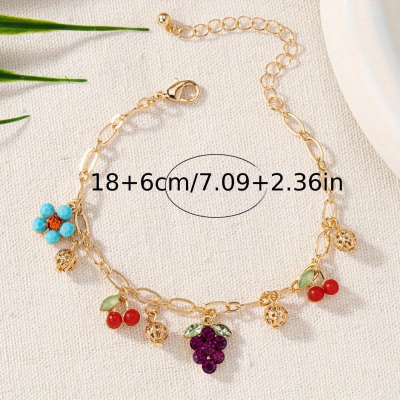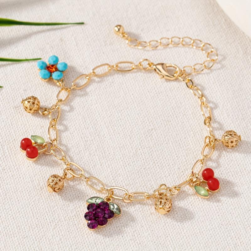 Elevate your casual attire with this charming bracelet featuring grape, blueberry, and floral charms. The adjustable chain is made of high-quality zinc alloy with a luxurious 18K gold plating.