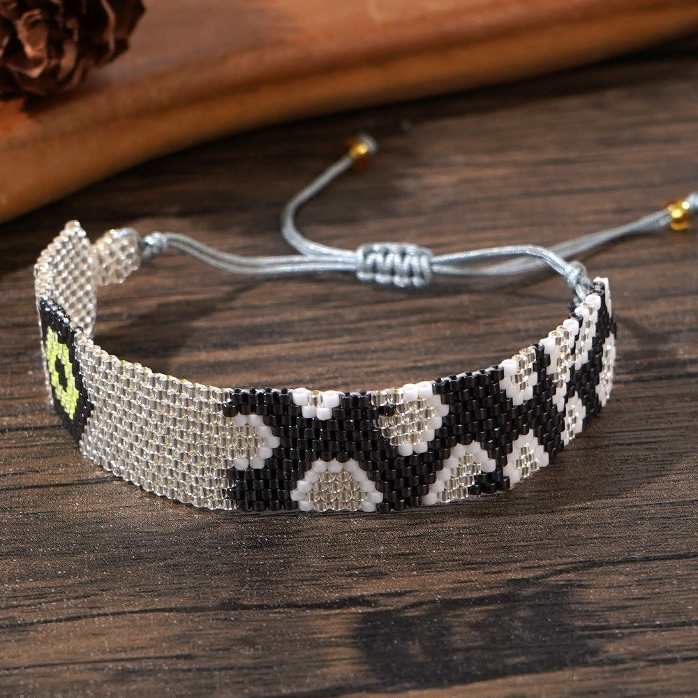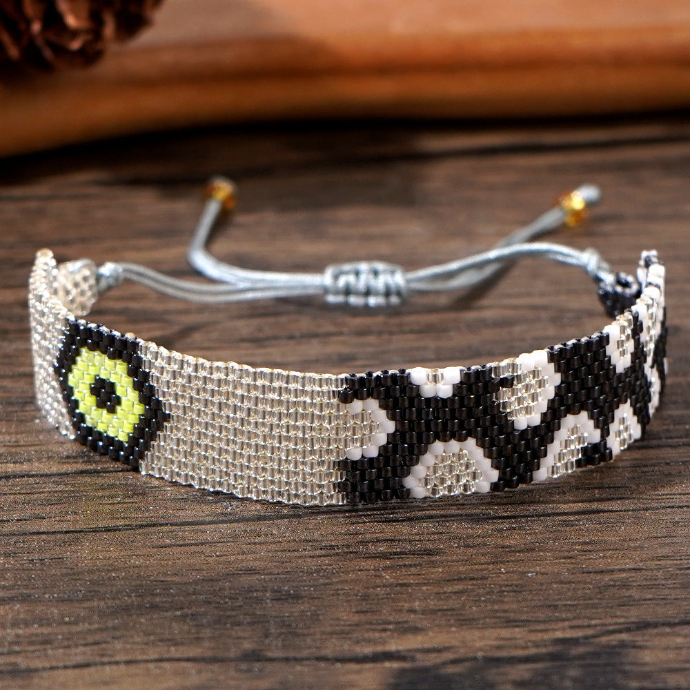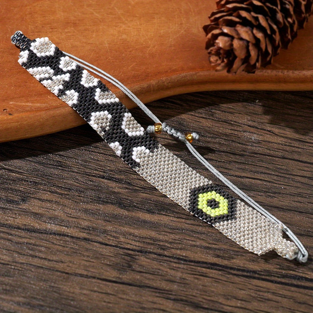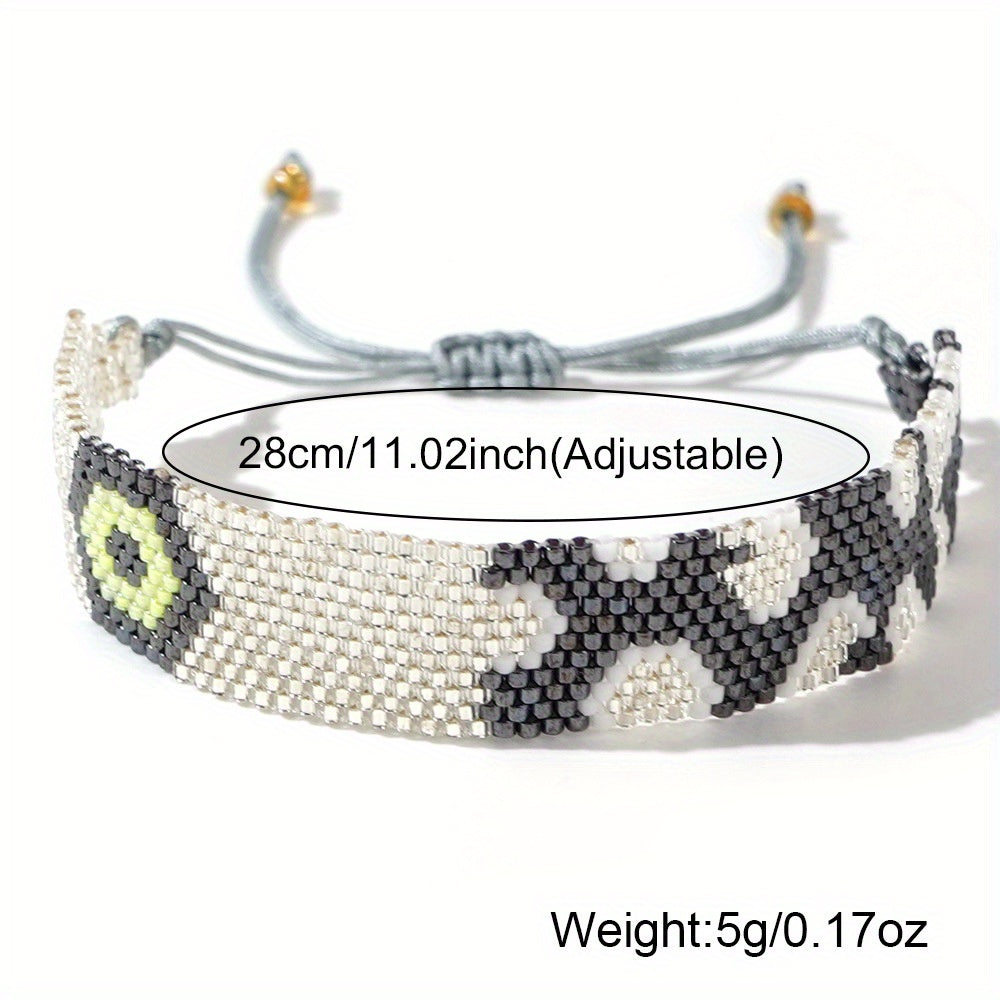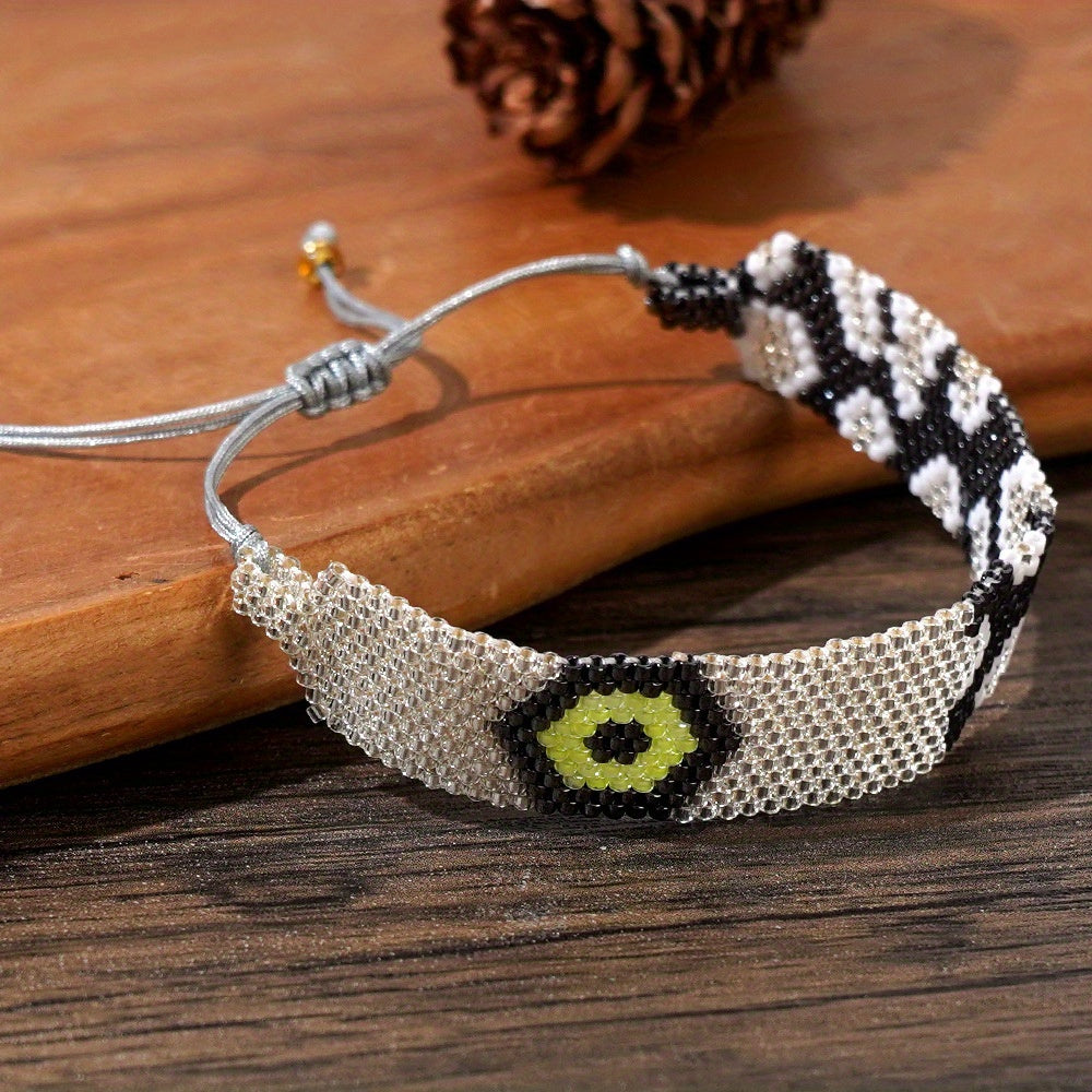 This bohemian glass bead bracelet is handcrafted with an adjustable cord and features an evil eye design. Perfect for daily wear, it makes an ideal gift for your spouse, couple, birthday, or holiday.