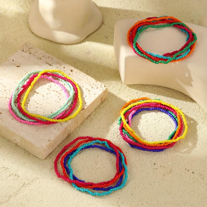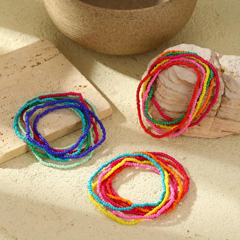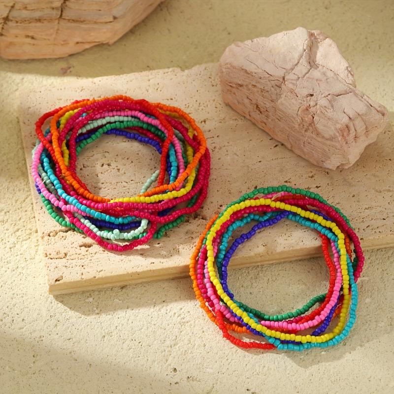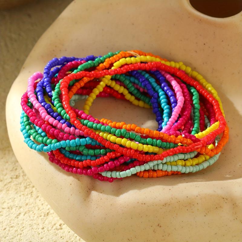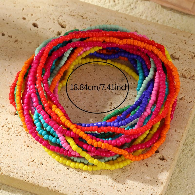 Elevate your style with this set of 20 Bohemian glass rice beads stacked bracelets. Perfect for adding a touch of boho chic to your outfit.