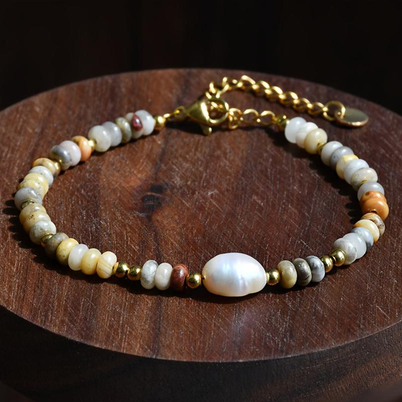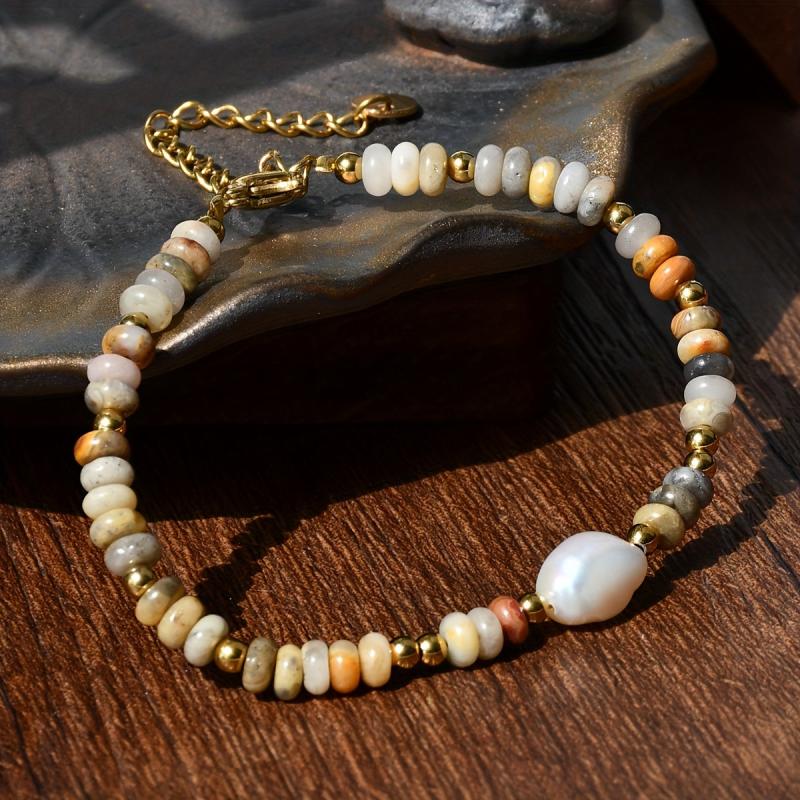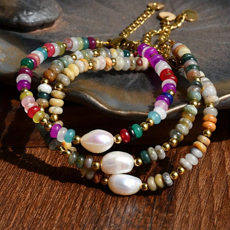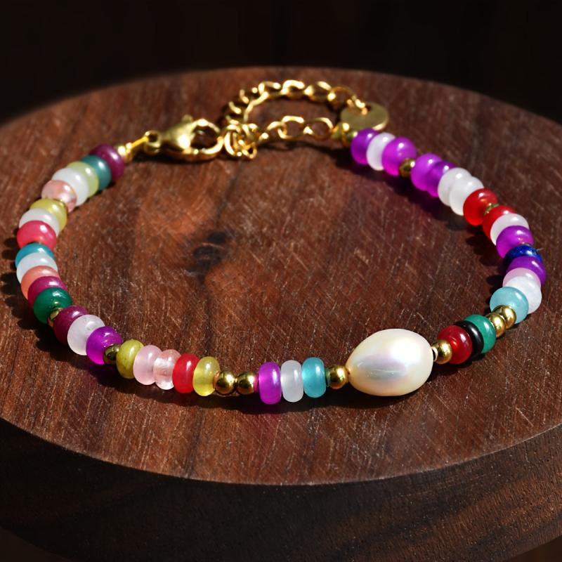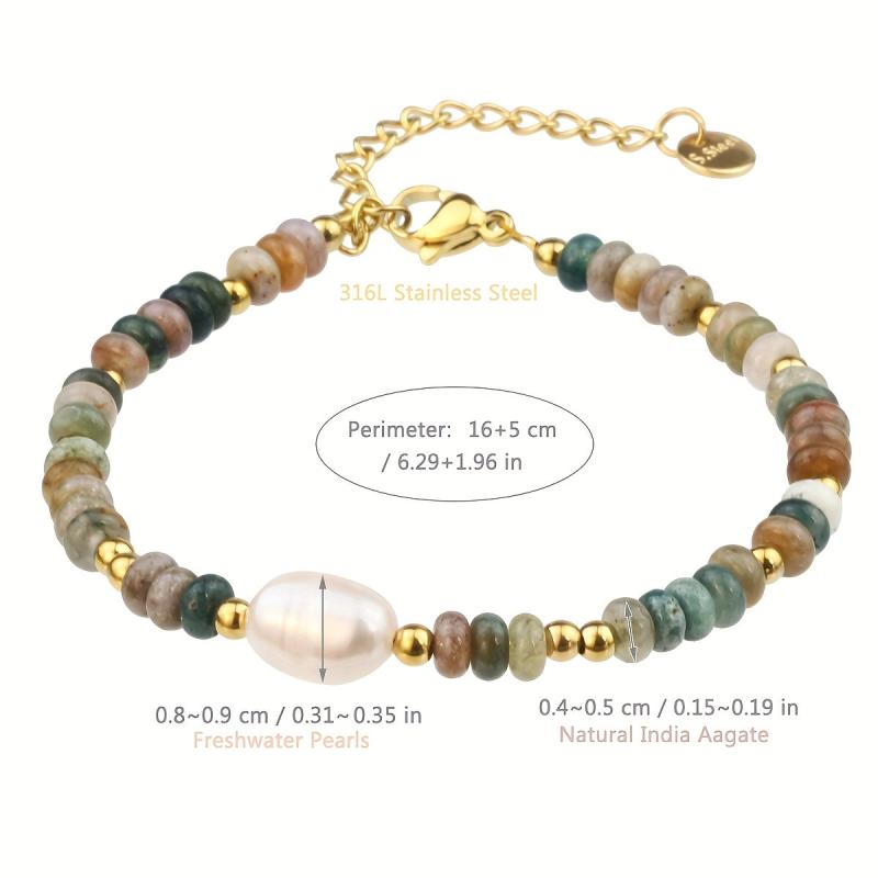Add a touch of vintage Bohemian style to your summer look with this stunning bracelet featuring Indian agate and baroque freshwater pearls. The golden tone spacers add a touch of elegance to the multicolor design.