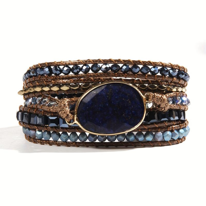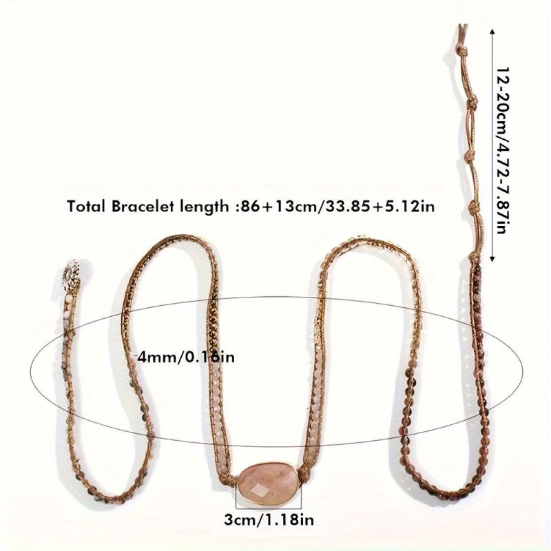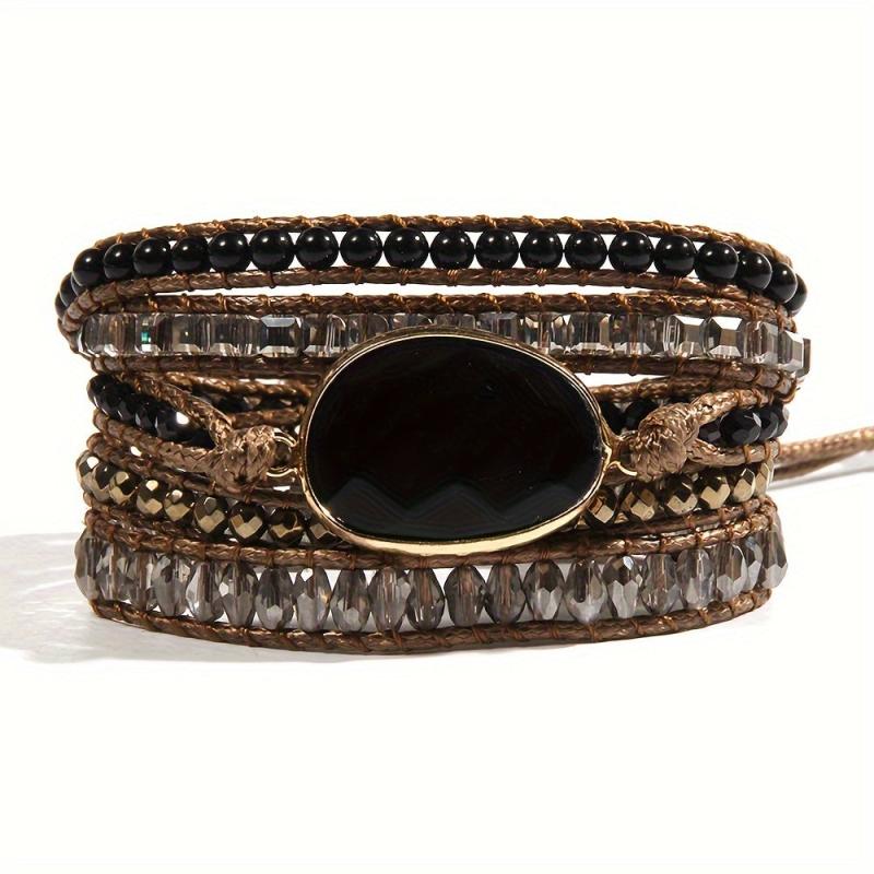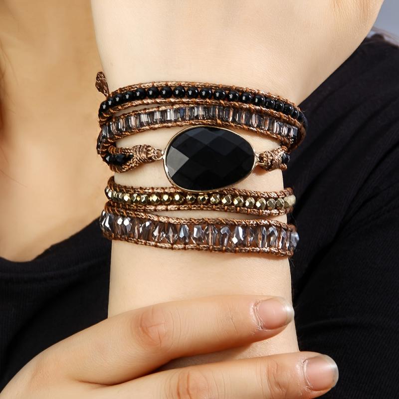 This Bohemian style bracelet features natural stones and glass beads braided on wax rope. It is a 5-row wrap bracelet that can be adjusted for a comfortable fit.
